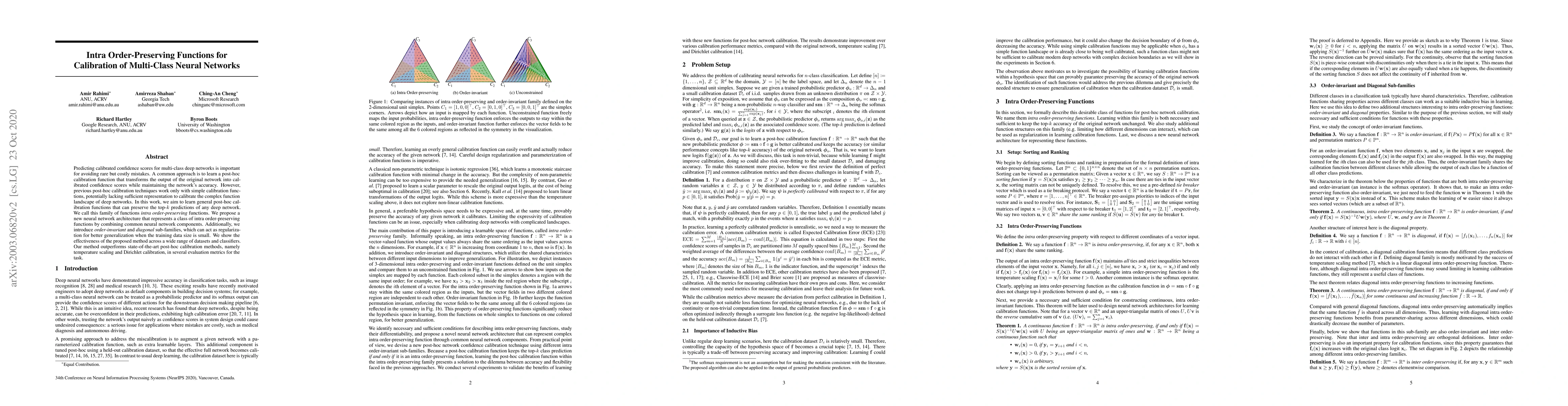 Predicting calibrated confidence scores for multi-class deep networks is important for avoiding rare but costly mistakes. A common approach is to learn a post-hoc calibration function that transforms the output of the original network into calibrated confidence scores while maintaining the network's accuracy. However, previous post-hoc calibration techniques work only with simple calibration functions, potentially lacking sufficient representation to calibrate the complex function landscape of deep networks. In this work, we aim to learn general post-hoc calibration functions that can preserve the top-k predictions of any deep network. We call this family of functions intra order-preserving functions. We propose a new neural network architecture that represents a class of intra order-preserving functions by combining common neural network components. Additionally, we introduce order-invariant and diagonal sub-families, which can act as regularization for better generalization when the training data size is small. We show the effectiveness of the proposed method across a wide range of datasets and classifiers. Our method outperforms state-of-the-art post-hoc calibration methods, namely temperature scaling and Dirichlet calibration, in several evaluation metrics for the task.