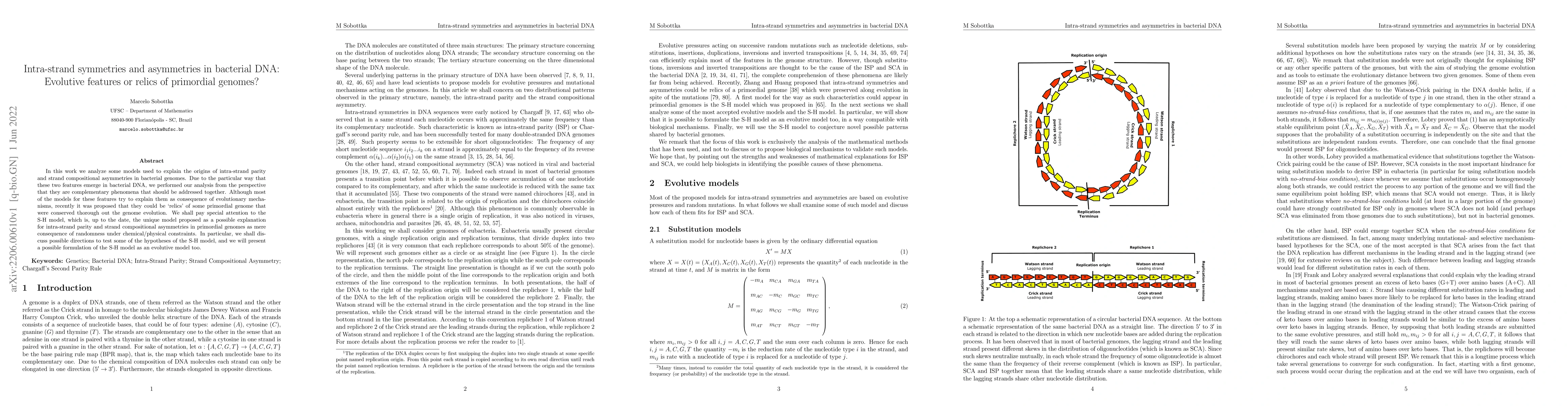 This paper examines models explaining intra-strand symmetries and asymmetries in bacterial DNA, debating whether these features are evolutionary outcomes or remnants of primordial genomes. It focuses on the S-H model, discussing its potential as both a primordial and evolutionary explanation.
