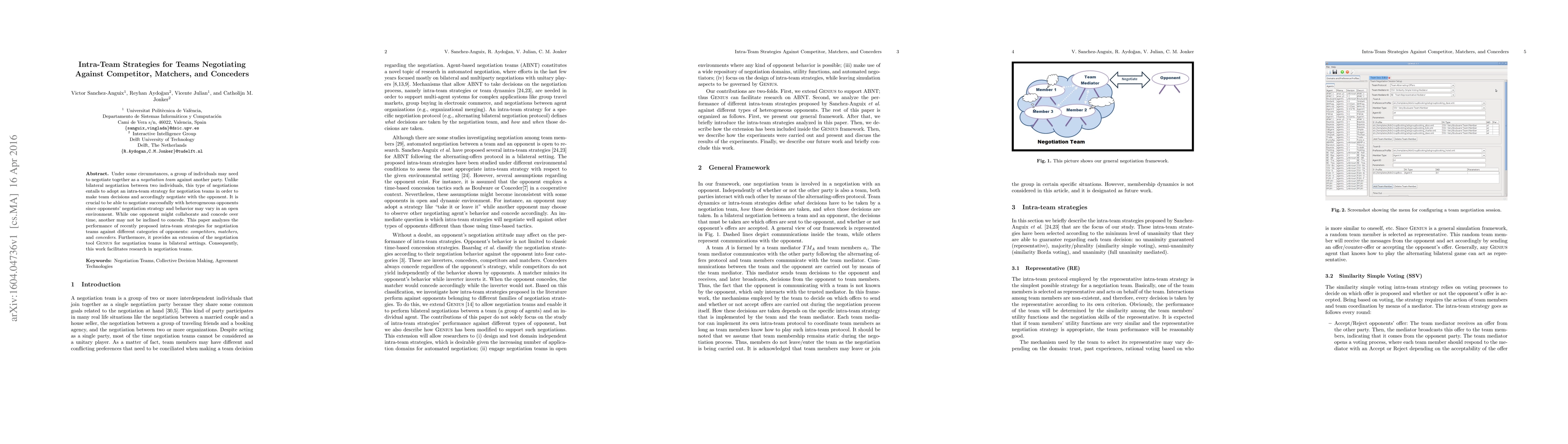 This paper analyzes intra-team negotiation strategies for teams negotiating against competitors, matchers, and conceders, aiming to improve team performance in heterogeneous environments.