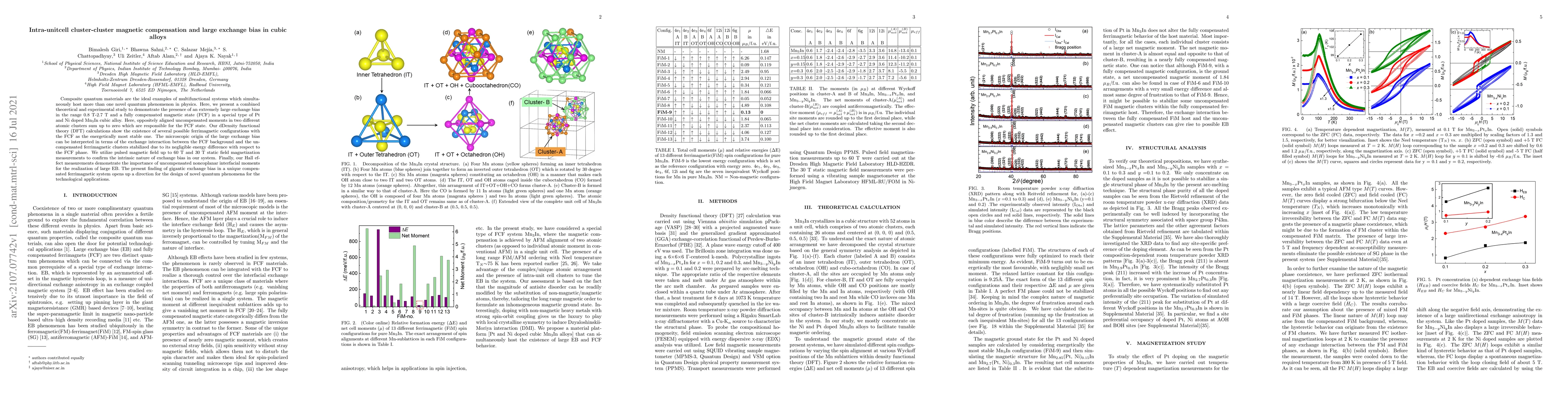 The research presents a Pt and Ni doped Mn3In cubic alloy with a fully compensated magnetic state and large exchange bias (0.8 T - 2.7 T), confirmed via high-field magnetization measurements. DFT calculations reveal the ferrimagnetic configurations causing this phenomenon, with uncompensated clusters contributing to the large exchange bias, hinting at potential for novel quantum material design.