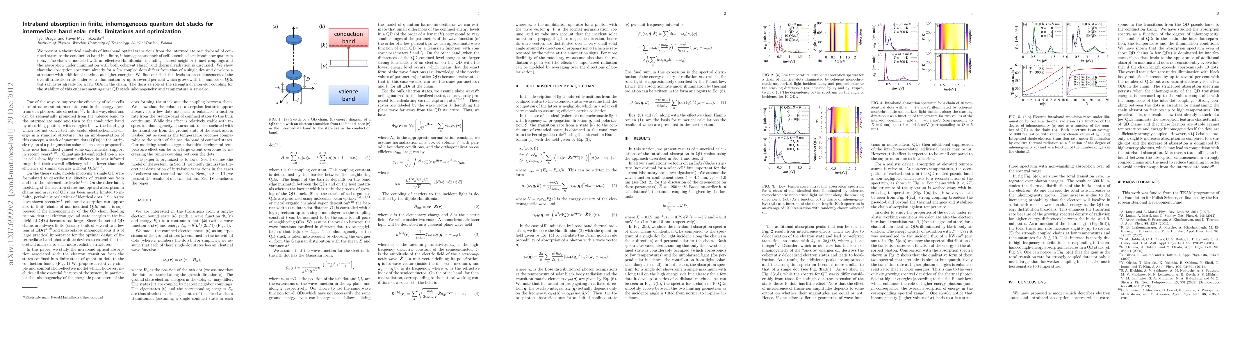 This research analyzes intraband optical transitions in quantum dot stacks for solar cells, finding that a few coupled dots' absorption spectrum differs from a single dot's, with additional maxima enhancing transition rates under solar illumination by up to several percent. The study reveals that inter-dot coupling strength is crucial for maintaining this enhancement against stack inhomogeneity and temperature variations.