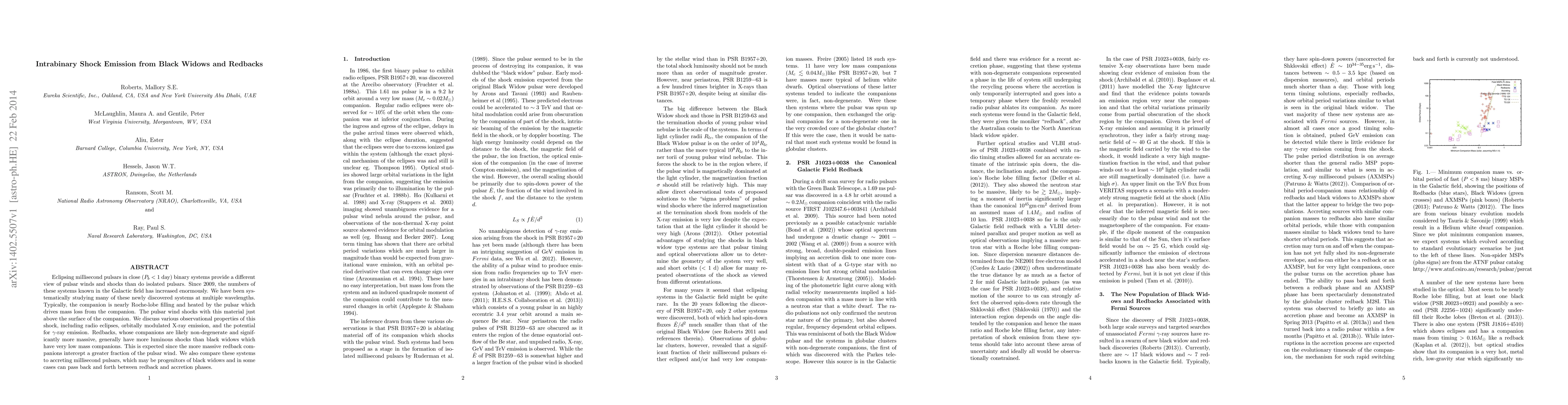 Eclipsing millisecond pulsars in close ($P_b < 1$~day) binary systems provide a different view of pulsar winds and shocks than do isolated pulsars. Since 2009, the numbers of these systems known in the Galactic field has increased enormously. We have been systematically studying many of these newly discovered systems at multiple wavelengths. Typically, the companion is nearly Roche-lobe filling and heated by the pulsar which drives mass loss from the companion. The pulsar wind shocks with this material just above the surface of the companion. We discuss various observational properties of this shock, including radio eclipses, orbitally modulated X-ray emission, and the potential for $\gamma$-ray emission. Redbacks, whose companions are likely non-degenerate and significantly more massive, generally have more luminous shocks than black widows which have very low mass companions. This is expected since the more massive redback companions intercept a greater fraction of the pulsar wind. We also compare these systems to accreting millisecond pulsars, which may be progenitors of black widows and in some cases can pass back and forth between redback and accretion phases.