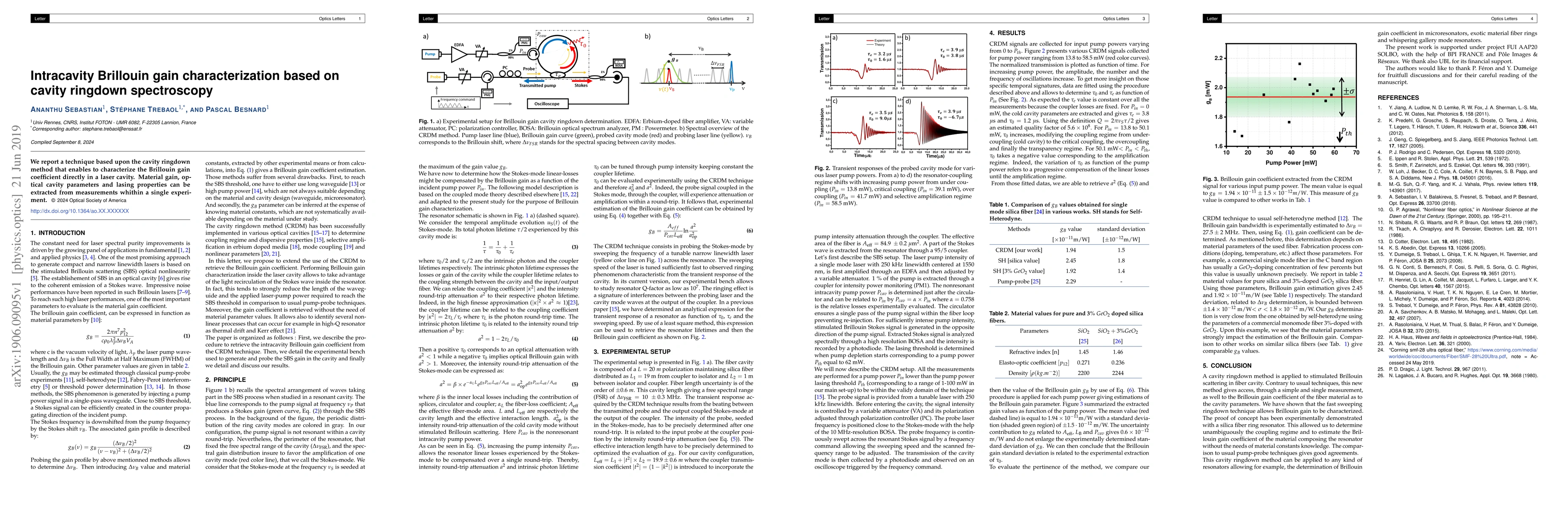 A new technique using cavity ringdown spectroscopy allows direct characterization of Brillouin gain coefficient in a laser cavity, extracting material gain, optical cavity parameters, and lasing properties from a single experiment.