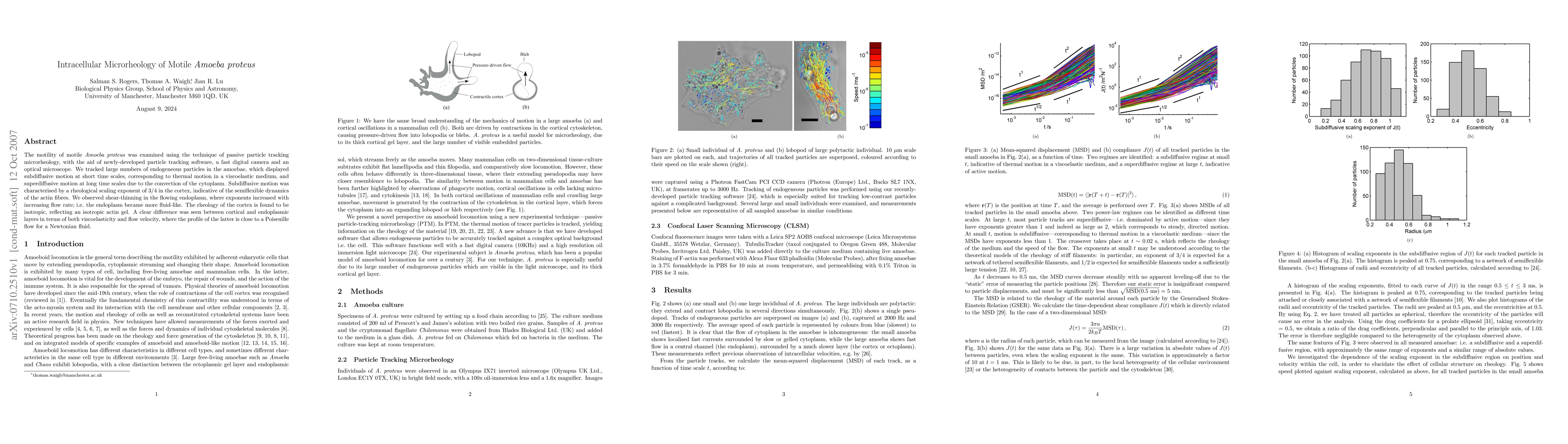 The study investigates the intracellular microrheology of Amoeba proteus using passive particle tracking microrheology, revealing subdiffusive motion in the cortex and superdiffusive motion in the endoplasm. It characterizes the cortex as an isotropic, viscoelastic actin gel and shows that the endoplasm exhibits shear-thinning behavior, transitioning to more fluid-like properties at higher flow rates.