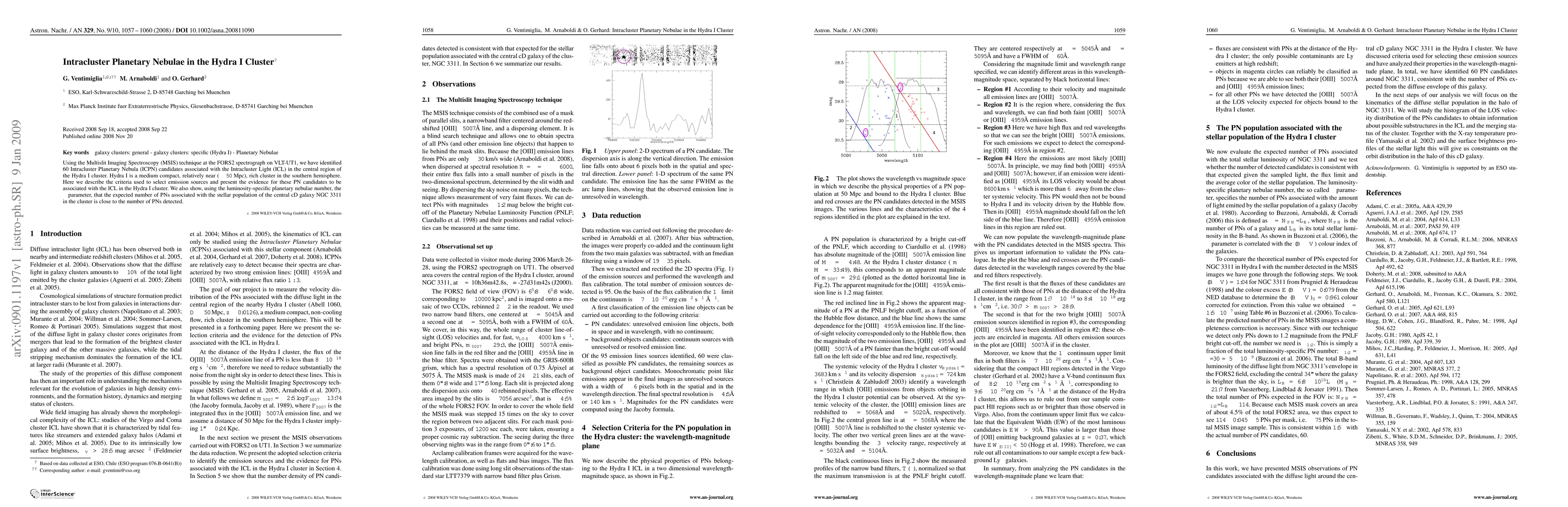 Using the Multislit Imaging Spectroscopy (MSIS) technique at the FORS2 spectrograph on VLT-UT1, we have identified 60 Intracluster Planetary Nebula (ICPN) candidates associated with the Intracluster Light (ICL) in the central region of the Hydra I cluster. Hydra I is a medium compact, relatively near (~50 Mpc), rich cluster in the southern hemisphere. Here we describe the criteria used to select emission sources and present the evidence for these PN candidates to be associated with the ICL in the Hydra I cluster. We also show, using the luminosity-specific planetary nebulae number, the alpha parameter, that the expected number of PNs associated with the stellar population of the central cD galaxy NGC 3311 in the cluster is close to the number of PNs detected.