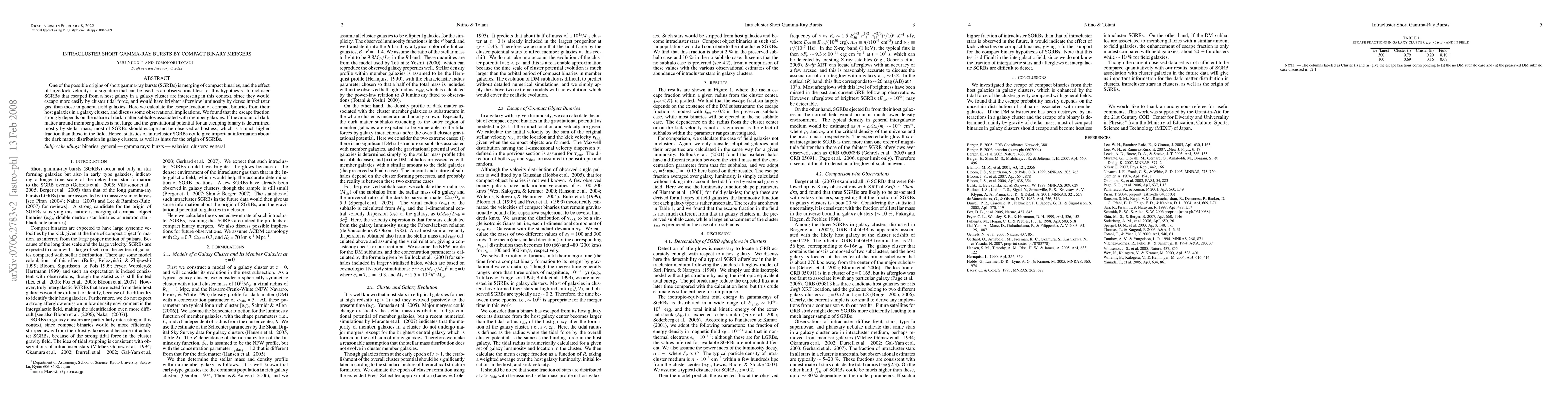 This paper investigates the origins of short gamma-ray bursts (SGRBs) from compact binary mergers and explores the escape fraction of these SGRBs from galaxy clusters. It concludes that a significant fraction of intracluster SGRBs could escape and be observed as hostless, providing insights into dark matter distribution and the nature of SGRB origins.