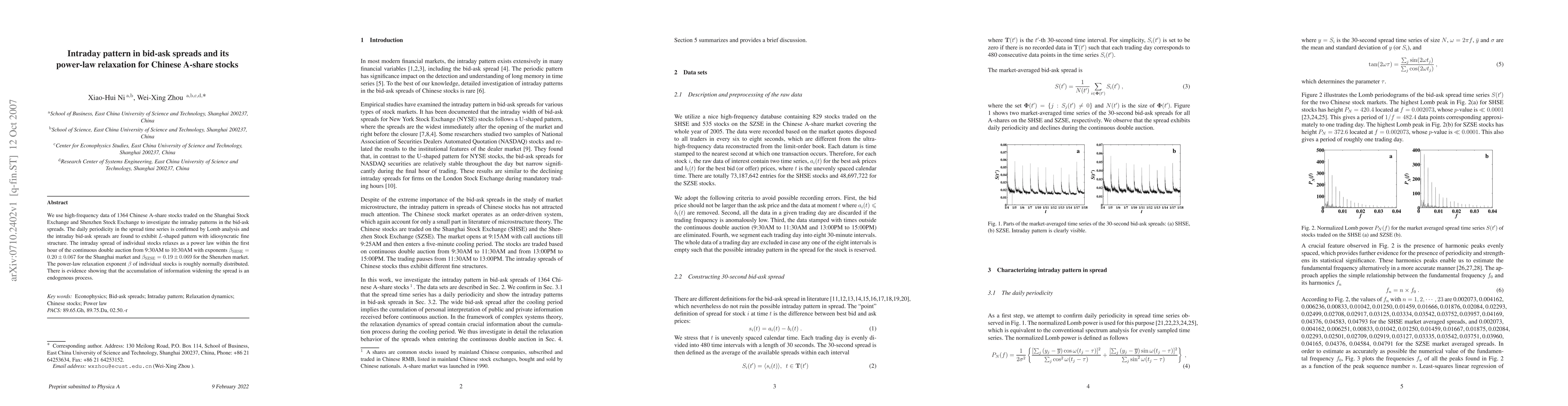 This study analyzes intraday patterns in bid-ask spreads for 1364 Chinese A-share stocks, revealing $L$-shaped spreads and a power-law relaxation within the first hour of trading. The relaxation exponent is normally distributed and suggests an endogenous information accumulation process.