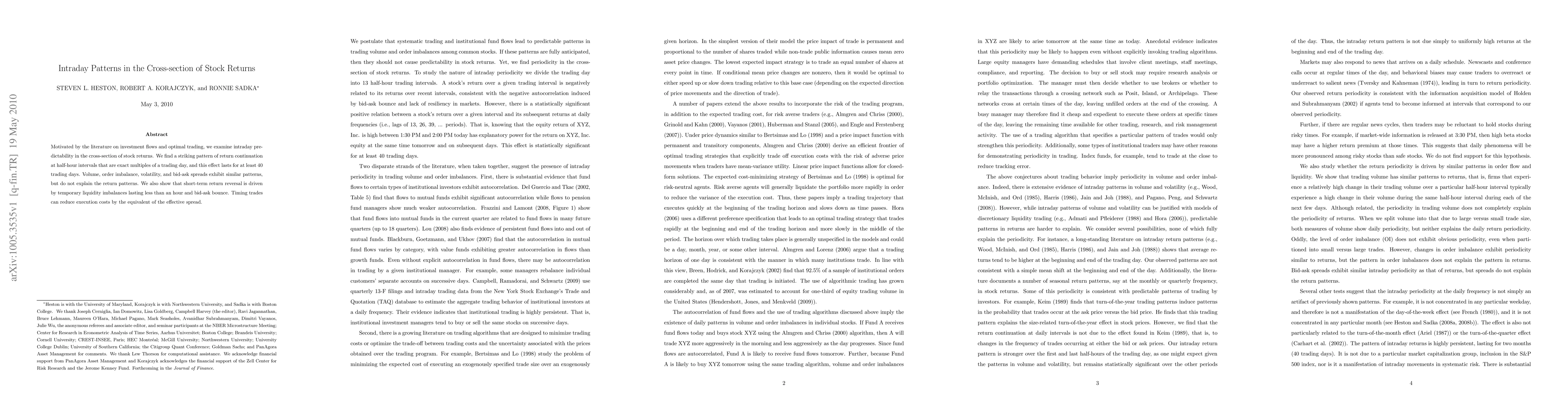 The study examines intraday patterns in stock returns using half-hour intervals from January 2001 to December 2005, focusing on predictable patterns in returns, volume, order imbalances, and volatility.