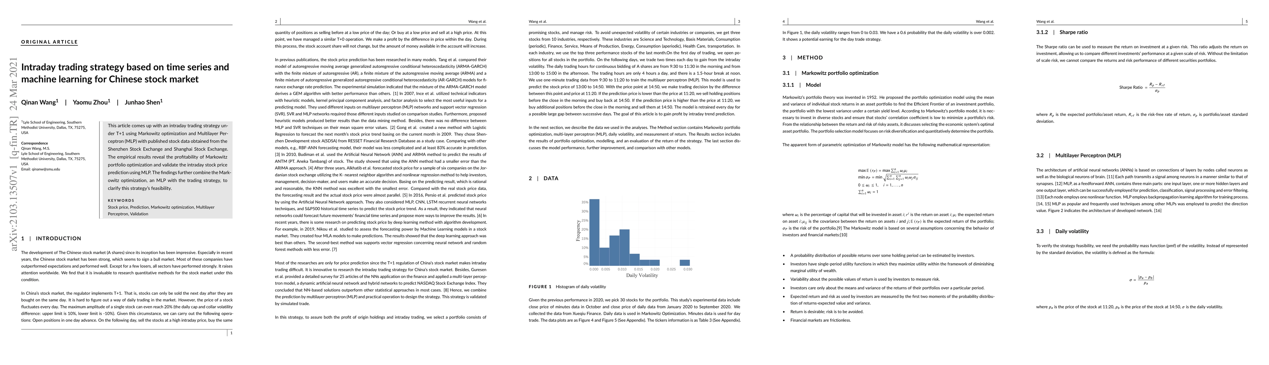 This article comes up with an intraday trading strategy under T+1 using Markowitz optimization and Multilayer Perceptron (MLP) with published stock data obtained from the Shenzhen Stock Exchange and Shanghai Stock Exchange. The empirical results reveal the profitability of Markowitz portfolio optimization and validate the intraday stock price prediction using MLP. The findings further combine the Markowitz optimization, an MLP with the trading strategy, to clarify this strategy's feasibility.