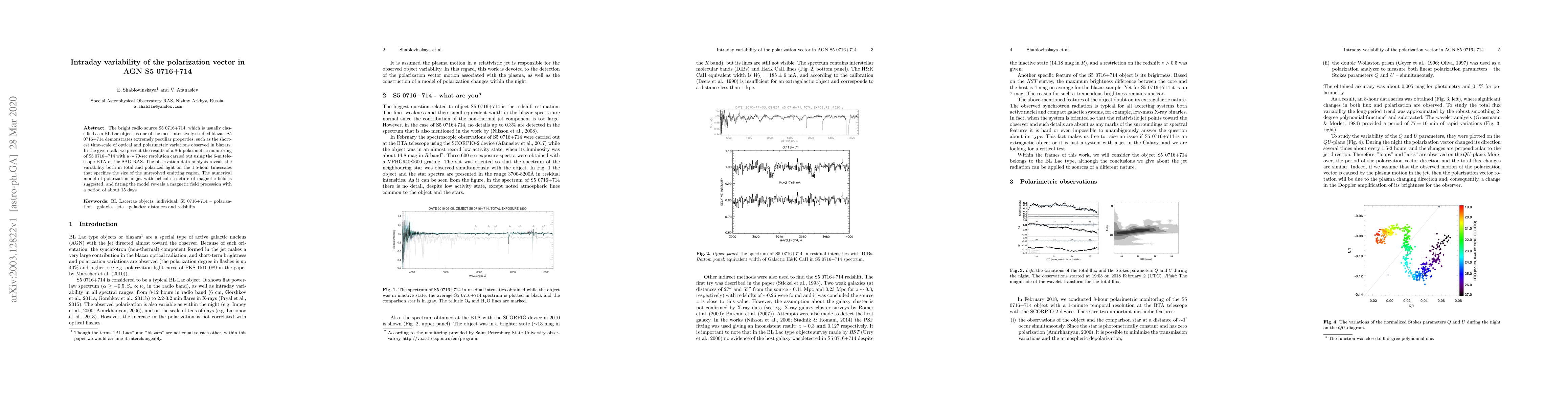 The bright radio source S5 0716+714, which is usually classified as a BL Lac object, is one of the most intensively studied blazar. S5 0716+714 demonstrates extremely peculiar properties, such as the shortest time-scale of optical and polarimetric variations observed in blazars. In the given talk, we present the results of 8-h polarimetric monitoring of S5 0716+714 with a $\sim70$-sec resolution carried out using the 6-m telescope BTA of the SAO RAS. The observation data analysis reveals the variability both in total and polarized light on the 1.5-hour timescales that specifies the size of the unresolved emitting region. The numerical model of polarization in jet with the helical structure of the magnetic field is suggested, and fitting the model reveals a magnetic field precession with a period of about 15 days.