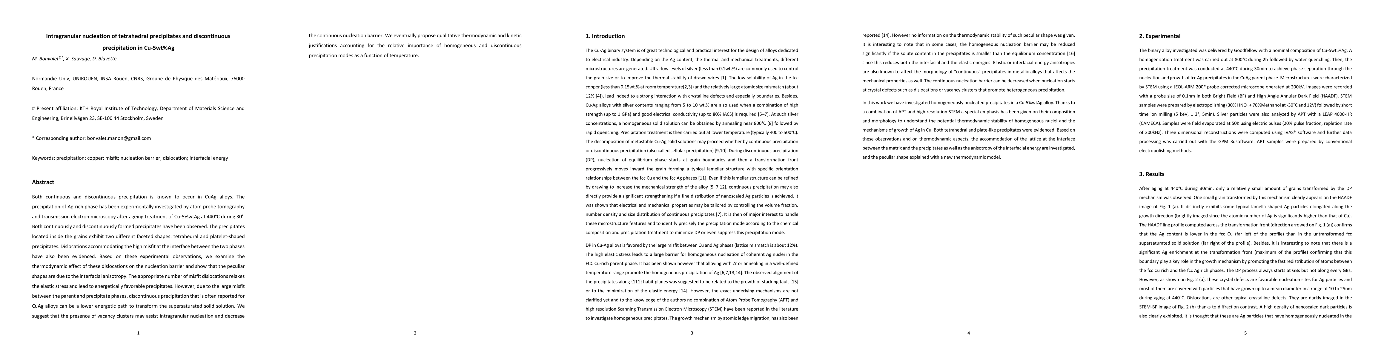 This paper investigates the precipitation behavior in Cu-5wt%Ag alloys using atom probe tomography and transmission electron microscopy, revealing both tetrahedral and platelet-shaped precipitates within grains. The study suggests that dislocations accommodating the high misfit reduce elastic stress, leading to energetically favorable precipitates, while large misfit promotes discontinuous precipitation as a lower energy transformation path.