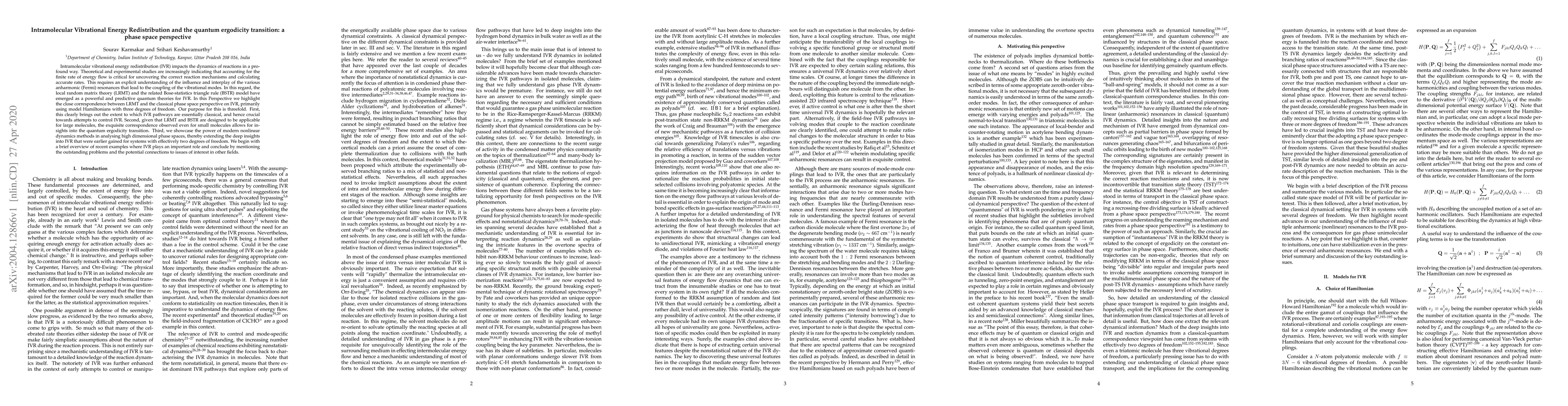 Intramolecular vibrational energy redistribution (IVR) impacts the dynamics of reactions in a profound way. Theoretical and experimental studies are increasingly indicating that accounting for the finite rate of energy flow is critical for uncovering the correct reaction mechanisms and calculating accurate rates. This requires an explicit understanding of the influence and interplay of the various anharmonic (Fermi) resonances that lead to the coupling of the vibrational modes. In this regard, the local random matrix theory (LRMT) and the related Bose-statistics triangle rule (BSTR) model have emerged as a powerful and predictive quantum theories for IVR. In this Perspective we highlight the close correspondence between LRMT and the classical phase space perspective on IVR, primarily using model Hamiltonians with three degrees of freedom. Our purpose for this is threefold. First, this clearly brings out the extent to which IVR pathways are essentially classical, and hence crucial towards attempts to control IVR. Second, given that LRMT and BSTR are designed to be applicable for large molecules, the exquisite correspondence observed even for small molecules allows for insights into the quantum ergodicity transition. Third, we showcase the power of modern nonlinear dynamics methods in analysing high dimensional phase spaces, thereby extending the deep insights into IVR that were earlier gained for systems with effectively two degrees of freedom. We begin with a brief overview of recent examples where IVR plays an important role and conclude by mentioning the outstanding problems and the potential connections to issues of interest in other fields.