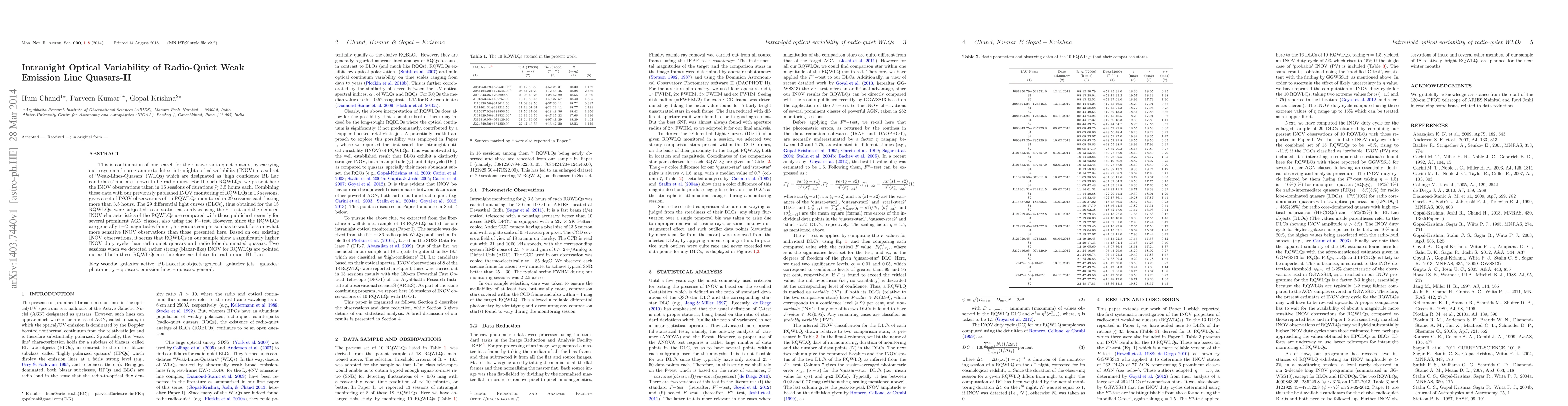 This is continuation of our search for the elusive radio-quiet blazars, by carrying out a systematic programme to detect intranight optical variability (INOV) in a subset of `Weak-Lines-Quasars' (WLQs) which are designated as `high confidence BL Lac candidates' and are known to be radio-quiet. For 10 such RQWLQs, we present here the INOV observations taken in 16 sessions of durations > 3.5 hours each. Combining these data with our previously published INOV monitoring of RQWLQs in 13 sessions, gives a set of INOV observations of 15 RQWLQs monitored in 29 sessions each lasting more than 3.5 hours. The 29 differential light curves (DLCs), thus obtained for the 15 RQWLQs, were subjected to an statistical analysis using the F-test and the deduced INOV characteristics of the RQWLQs are compared with those published recently for several prominent AGN classes, also using the F-test. However, since the RQWLQs are generally 1-2 magnitudes fainter, a rigorous comparison has to wait for somewhat more sensitive INOV observations than those presented here. Based on our existing INOV observations, it seems that RQWLQs in our sample show a significantly higher INOV duty cycle than radio-quiet quasars and radio lobe-dominated quasars. Two sessions when we detected rather strong (blazar-like) INOV for RQWLQs are pointed out and both these RQWLQs are therefore candidates for radio-quiet BL Lacs.