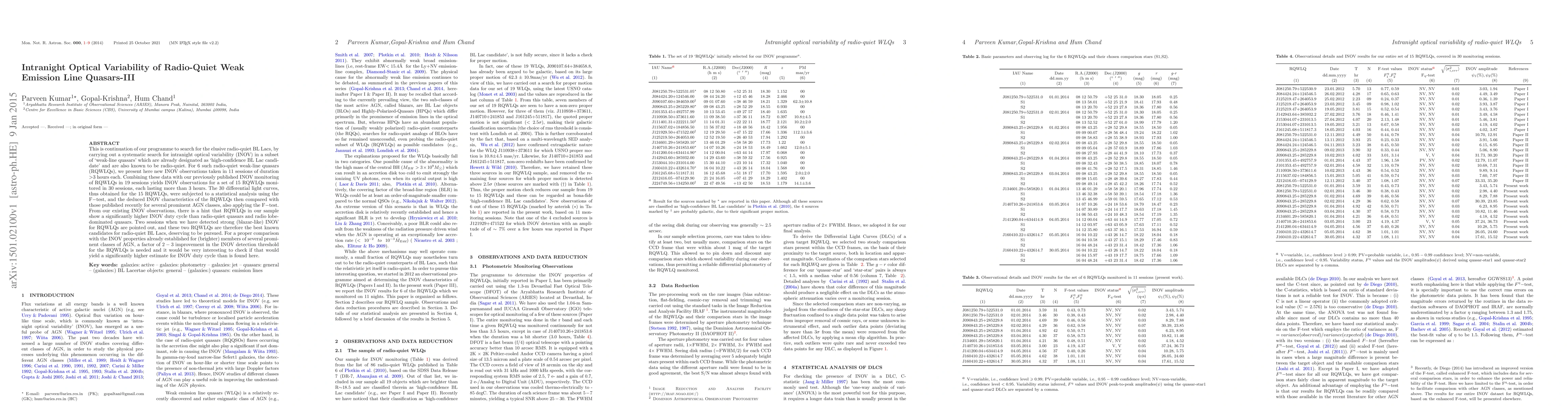 This is continuation of our programme to search for the elusive radio-quiet BL Lacs, by carrying out a systematic search for intranight optical variability (INOV) in a subset of `weak-line quasars' which are already designated as `high-confidence BL Lac candidate' and are also known to be radio-quiet. For 6 such radio-quiet weak-line quasars (RQWLQs), we present here new INOV observations taken in 11 sessions of duration >3 hours each. Combining these data with our previously published INOV monitoring of RQWLQs in 19 sessions yields INOV observations for a set of 15 RQWLQs monitored in 30 sessions, each lasting more than 3 hours. The 30 differential light curves, thus obtained for the 15 RQWLQs, were subjected to a statistical analysis using the F-test, and the deduced INOV characteristics of the RQWLQs then compared with those published recently for several prominent AGN classes, also applying the F-test. From our existing INOV observations, there is a hint that RQWLQs in our sample show a significantly higher INOV duty cycle than radio-quiet quasars and radio lobe-dominated quasars. Two sessions when we have detected strong (blazar-like) INOV for RQWLQs are pointed out, and these two RQWLQs are therefore the best known candidates for radio-quiet BL Lacs, deserving to be pursued. For a proper comparison with the INOV properties already established for (brighter) members of several prominent classes of AGN, a factor of 2-3 improvement in the INOV detection threshold for the RQWLQs is needed and it would be very interesting to check if that would yield a significantly higher estimate for INOV duty cycle than is found here.