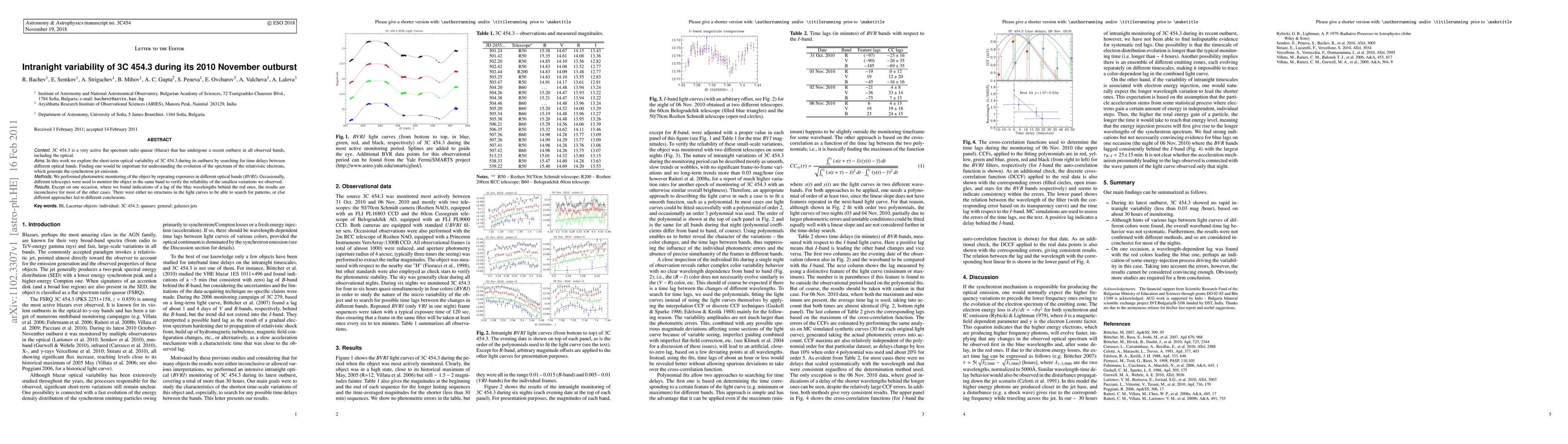 Context. 3C 454.3 is a very active flat spectrum radio quasar (blazar) that has undergone a recent outburst in all observed bands, including the optical. Aims. In this work we explore the short-term optical variability of 3C 454.3 during its outburst by searching for time delays between different optical bands. Finding one would be important for understanding the evolution of the spectrum of the relativistic electrons, which generate the synchrotron jet emission. Methods. We performed photometric monitoring of the object by repeating exposures in different optical bands (BVRI). Occasionally, different telescopes were used to monitor the object in the same band to verify the reliability of the smallest variations we observed. Results. Except on one occasion, where we found indications of a lag of the blue wavelengths behind the red ones, the results are inconclusive for most of the other cases. There were either no structures in the light curves to be able to search for patterns, or else different approaches led to different conclusions.