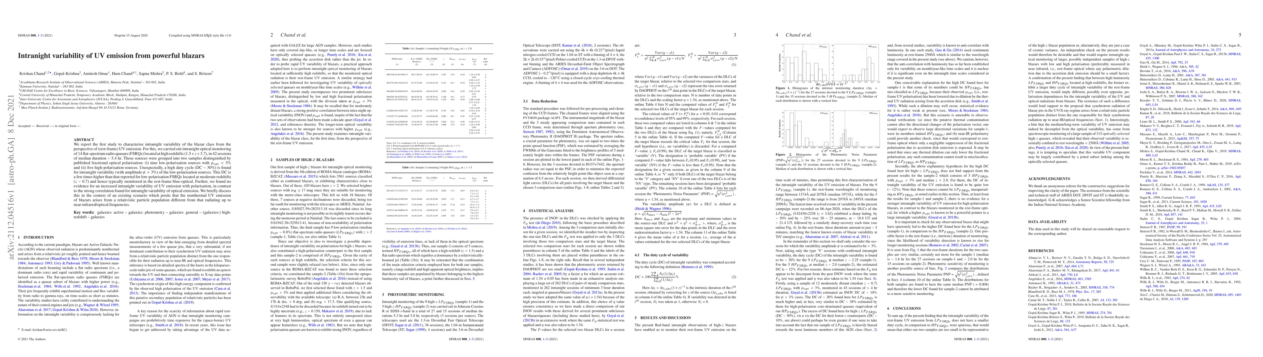 This study characterizes the intranight variability of UV emission from high-redshift flat-spectrum radio quasars, finding a high duty cycle of variability in low-polarisation sources. Contrary to optical emission, no increased variability is observed in high-polarisation sources, suggesting different emission mechanisms for UV and optical emissions.