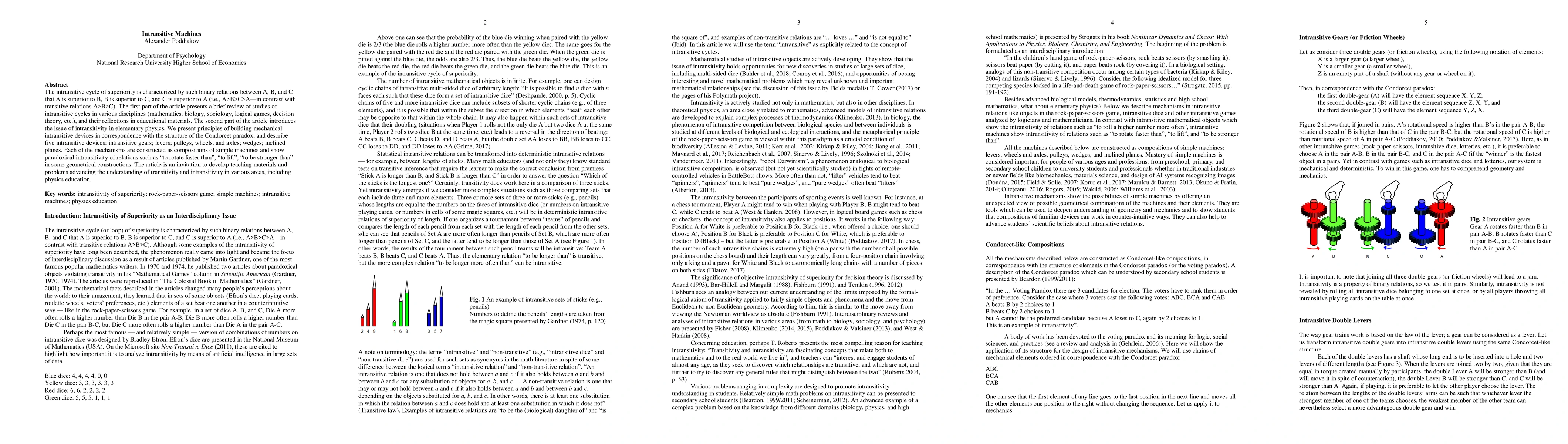 This paper reviews intransitive cycles across various disciplines and introduces mechanical intransitive devices based on the Condorcet paradox. It describes five paradoxical machines that demonstrate non-transitive relations in physics, aiming to enhance educational materials on transitivity concepts.