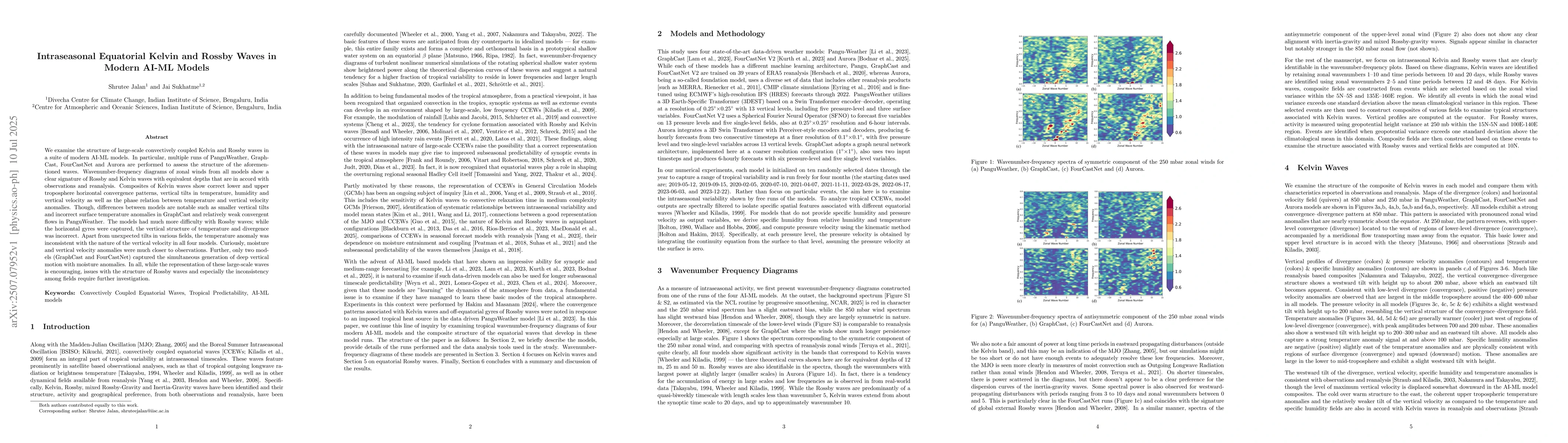 We examine the structure of large-scale convectively coupled Kelvin and Rossby waves in a suite of modern AI-ML models. In particular, multiple runs of PanguWeather, GraphCast, FourCastNet and Aurora are performed to assess the structure of the aforementioned waves. Wavenumber-frequency diagrams of zonal winds from all models show a clear signature of Rossby and Kelvin waves with equivalent depths that are in accord with observations and reanalysis. Composites of Kelvin waves show correct lower and upper troposphere horizontal convergence patterns, vertical tilts in temperature, humidity and vertical velocity as well as the phase relation between temperature and vertical velocity anomalies. Though, differences between models are notable such as smaller vertical tilts and incorrect surface temperature anomalies in GraphCast and relatively weak convergent flows in PanguWeather. The models had much more difficulty with Rossby waves; while the horizontal gyres were captured, the vertical structure of temperature and divergence was incorrect. Apart from unexpected tilts in various fields, the temperature anomaly was inconsistent with the nature of the vertical velocity in all four models. Curiously, moisture and vertical velocity anomalies were much closer to observations. Further, only two models (GraphCast and FourCastNet) captured the simultaneous generation of deep vertical motion with moisture anomalies. In all, while the representation of these large-scale waves is encouraging, issues with the structure of Rossby waves and especially the inconsistency among fields require further investigation.