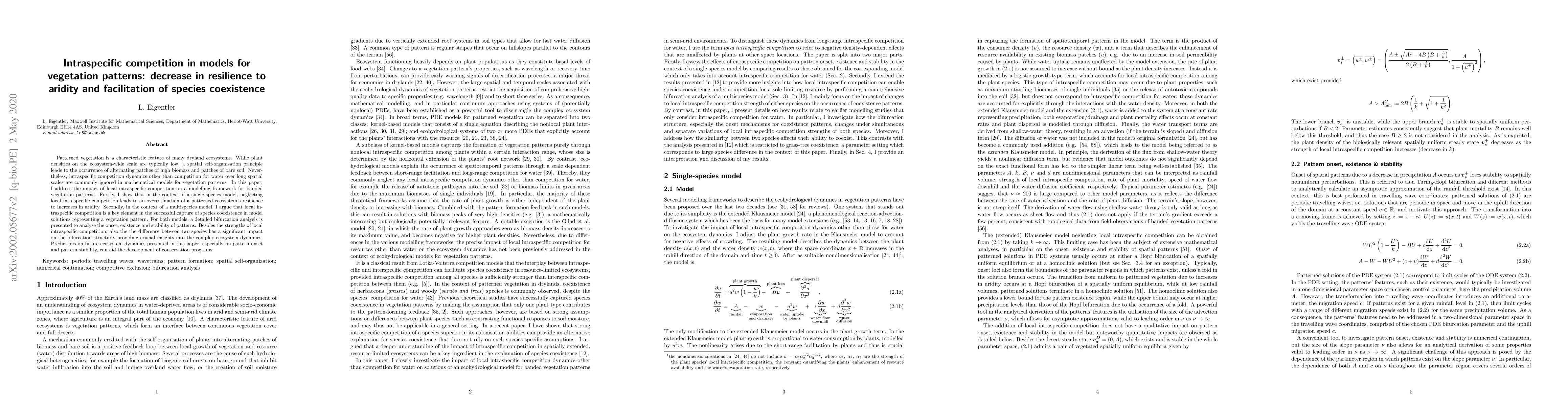 Patterned vegetation is a characteristic feature of many dryland ecosystems. While plant densities on the ecosystem-wide scale are typically low, a spatial self-organisation principle leads to the occurrence of alternating patches of high biomass and patches of bare soil. Nevertheless, intraspecific competition dynamics other than competition for water over long spatial scales are commonly ignored in mathematical models for vegetation patterns. In this chapter, I address the impact of local intraspecific competition on a modelling framework for banded vegetation patterns. Firstly, I show that in the context of a single-species model, neglecting local intraspecific competition leads to an overestimation of a patterned ecosystem's resilience to increases in aridity. Secondly, in the context of a multispecies model, I argue that local intraspecific competition is a key element in the successful capture of species coexistence in model solutions representing a vegetation pattern. For both models, a detailed bifurcation analysis is presented to analyse the onset, existence and stability of patterns. Besides the strengths of local intraspecific competition, also the the difference between two species has a significant impact on the bifurcation structure, providing crucial insights into the complex ecosystem dynamics. Predictions on future ecosystem dynamics presented in this chapter, especially on pattern onset and pattern stability, can aid the development of conservation programs.