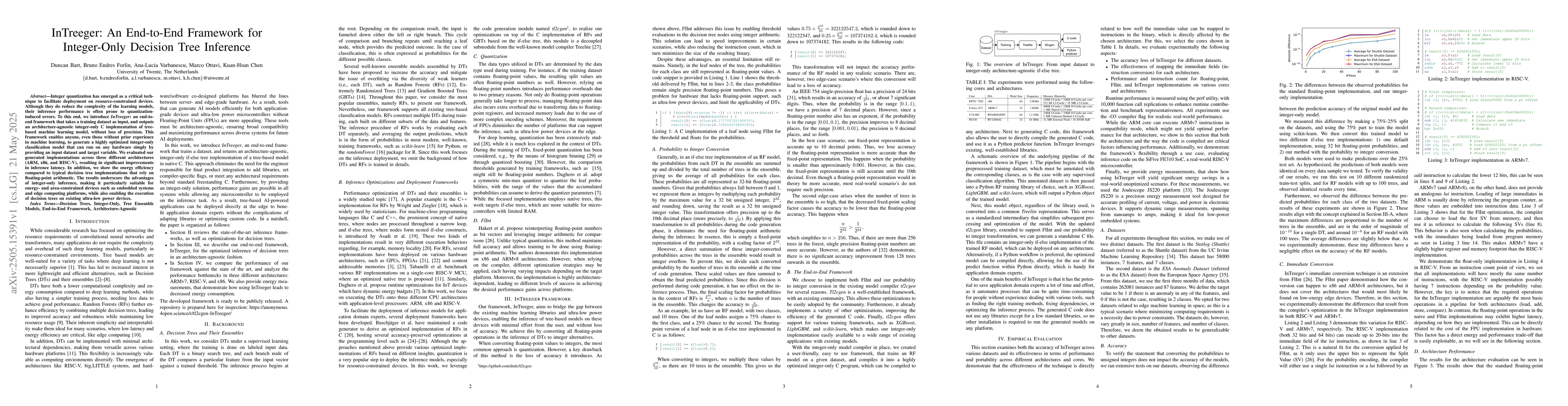 The paper introduces InTreeger, an end-to-end framework that converts a given training dataset into an architecture-agnostic, highly optimized integer-only C implementation of tree-based machine learning models, ensuring no loss in precision.