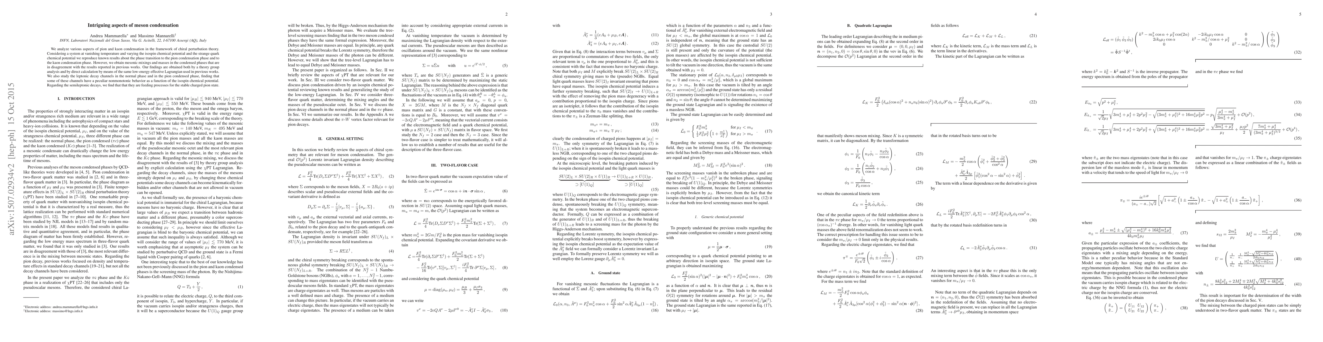 We analyze various aspects of pion and kaon condensation in the framework of chiral perturbation theory. Considering a system at vanishing temperature and varying the isospin chemical potential and the strange quark chemical potential we reproduce known results about the phase transition to the pion condensation phase and to the kaon condensation phase. However, we obtain mesonic mixings and masses in the condensed phases that are in disagreement with the results reported in previous works. Our findings are obtained both by a theory group analysis and by direct calculation by means of the same low-energy effective Lagrangian used in previous works. We also study the leptonic decay channels in the normal phase and in the pion condensed phase, finding that some of these channels have a peculiar nonmonotonic behavior as a function of the isospin chemical potential. Regarding the semileptonic decays, we find that that they should be efficient feeding processes for the stable charged pion state.