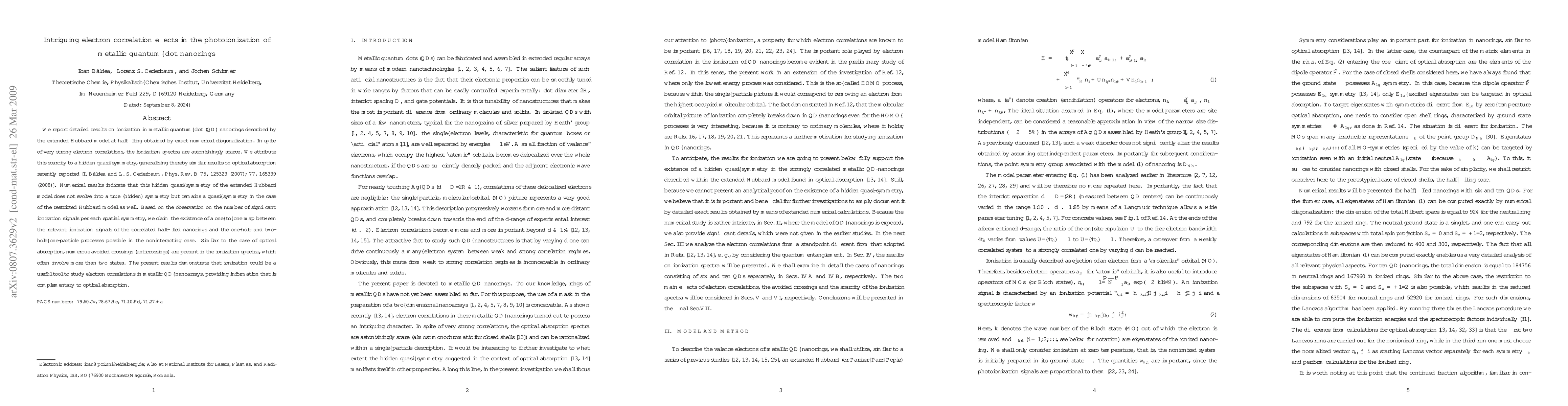We report detailed results on ionization in metallic quantum--dot (QD) nanorings described by the extended Hubbard model at half filling obtained by exact numerical diagonalization. In spite of very strong electron correlations, the ionization spectra are astonishingly scarce. We attribute this scarcity to a hidden quasi--symmetry, generalizing thereby similar results on optical absorption recently reported [I. Baldea and L. S. Cederbaum, \prb {\bf 75}, 125323 (2007); {\bf 77}, 165339 (2008)]. Numerical results indicate that this hidden quasi--symmetry of the extended Hubbard model does not evolve into a true (hidden) symmetry but remains a quasi--symmetry in the case of the restricted Hubbard model as well. Based on the observation on the number of significant ionization signals per each spatial symmetry, we claim the existence of a one--to--one map between the relevant ionization signals of the correlated half-filled nanorings and the one-hole and two-hole--one-particle processes possible in the noninteracting case. Similar to the case of optical absorption, numerous avoided crossings (anticrossings) are present in the ionization spectra, which often involve more than two states. The present results demonstrate that ionization could be a useful tool to study electron correlations in metallic QD--nanoarrays, providing information that is complementary to optical absorption.