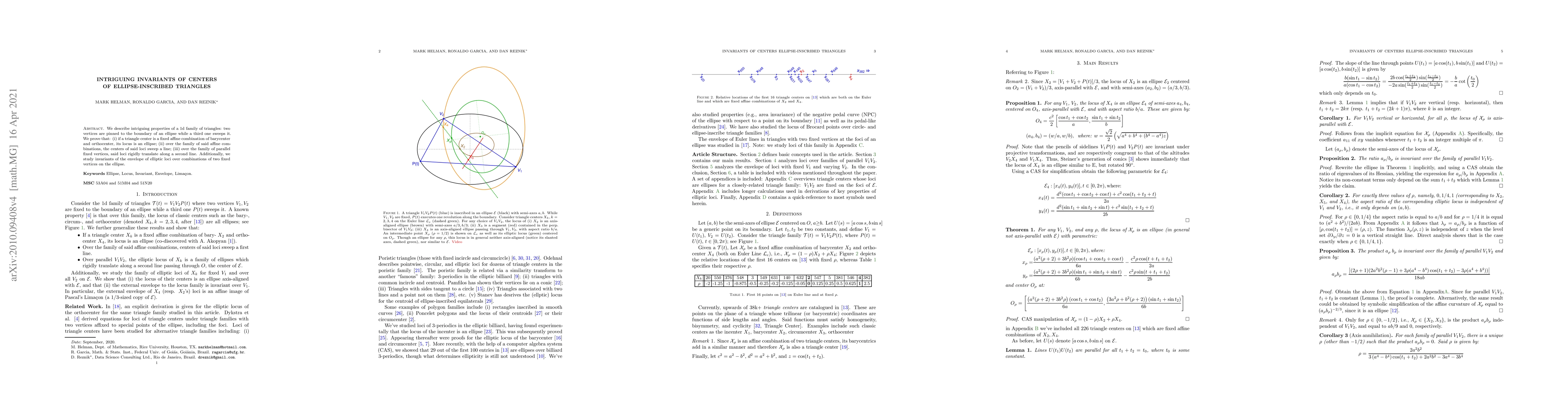 We describe invariants of centers of ellipse-inscribed triangle families with two vertices fixed to the ellipse boundary and a third one which sweeps it. We prove that: (i) if a triangle center is a fixed affine combination of barycenter and orthocenter, its locus is an ellipse; (ii) and that over the family of said affine combinations, the centers of said loci sweep a line; (iii) over the family of parallel fixed vertices, said loci rigidly translate along a second line. Additionally, we study invariants of the envelope of elliptic loci over combinations of two fixed vertices on the ellipse.