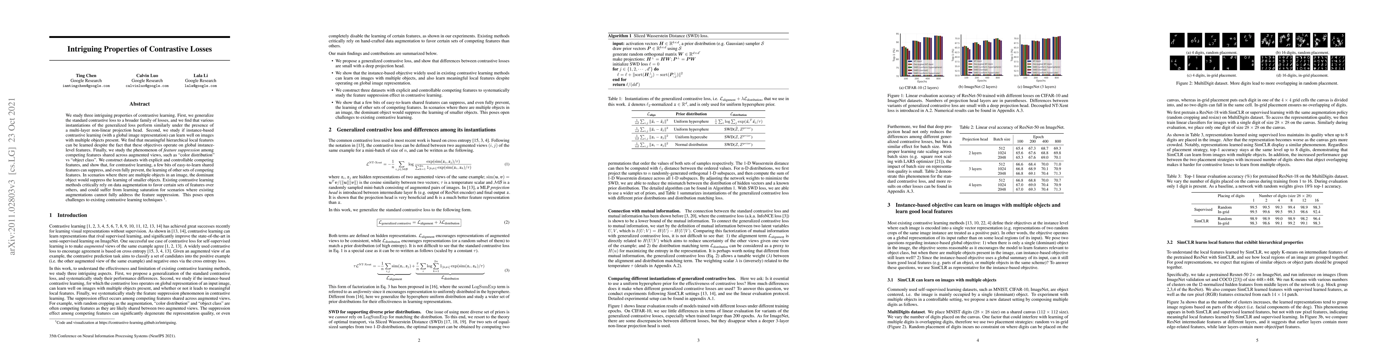 We study three intriguing properties of contrastive learning. First, we generalize the standard contrastive loss to a broader family of losses, and we find that various instantiations of the generalized loss perform similarly under the presence of a multi-layer non-linear projection head. Second, we study if instance-based contrastive learning (with a global image representation) can learn well on images with multiple objects present. We find that meaningful hierarchical local features can be learned despite the fact that these objectives operate on global instance-level features. Finally, we study the phenomenon of feature suppression among competing features shared across augmented views, such as "color distribution" vs "object class". We construct datasets with explicit and controllable competing features, and show that, for contrastive learning, a few bits of easy-to-learn shared features can suppress, and even fully prevent, the learning of other sets of competing features. In scenarios where there are multiple objects in an image, the dominant object would suppress the learning of smaller objects. Existing contrastive learning methods critically rely on data augmentation to favor certain sets of features over others, and could suffer from learning saturation for scenarios where existing augmentations cannot fully address the feature suppression. This poses open challenges to existing contrastive learning techniques.