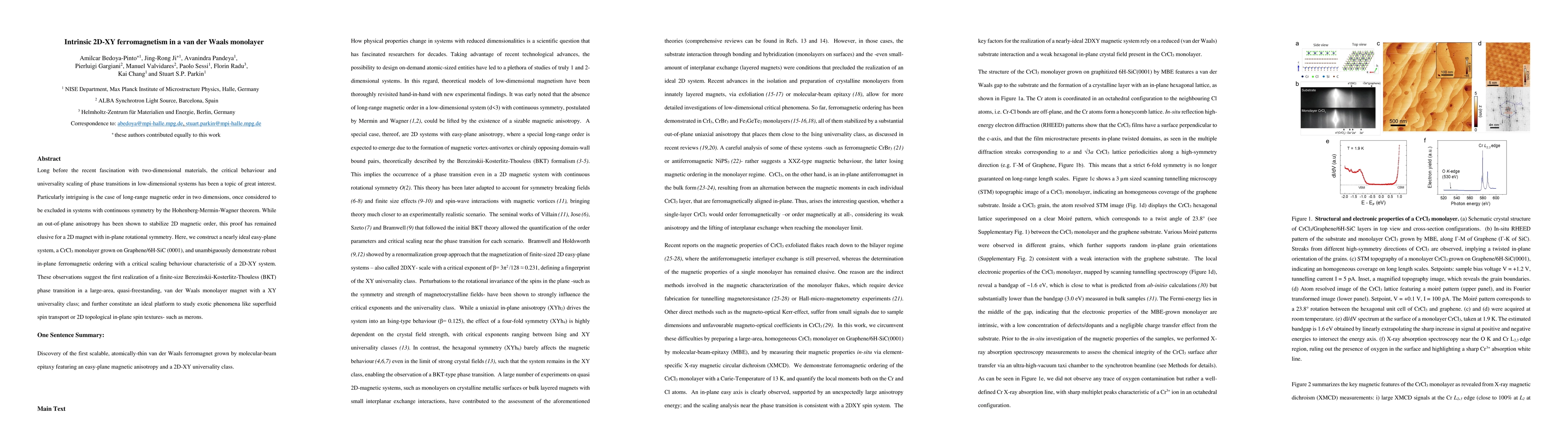 Long before the recent fascination with two-dimensional materials, the critical behaviour and universality scaling of phase transitions in low-dimensional systems has been a topic of great interest. Particularly intriguing is the case of long-range magnetic order in two dimensions, once considered to be excluded in systems with continuous symmetry by the Hohenberg-Mermin-Wagner theorem. While an out-of-plane anisotropy has been shown to stabilize 2D magnetic order, this proof has remained elusive for a 2D magnet with in-plane rotational symmetry. Here, we construct a nearly ideal easy-plane system, a CrCl3 monolayer grown on Graphene/6H-SiC (0001), and unambiguously demonstrate robust in-plane ferromagnetic ordering with a critical scaling behaviour characteristic of a 2D-XY system. These observations suggest the first realization of a finite-size Berezinskii-Kosterlitz-Thouless (BKT) phase transition in a large-area, quasi-freestanding, van der Waals monolayer magnet with a XY universality class; and further constitute an ideal platform to study exotic phenomena like superfluid spin transport or 2D topological in-plane spin textures -- such as merons.
