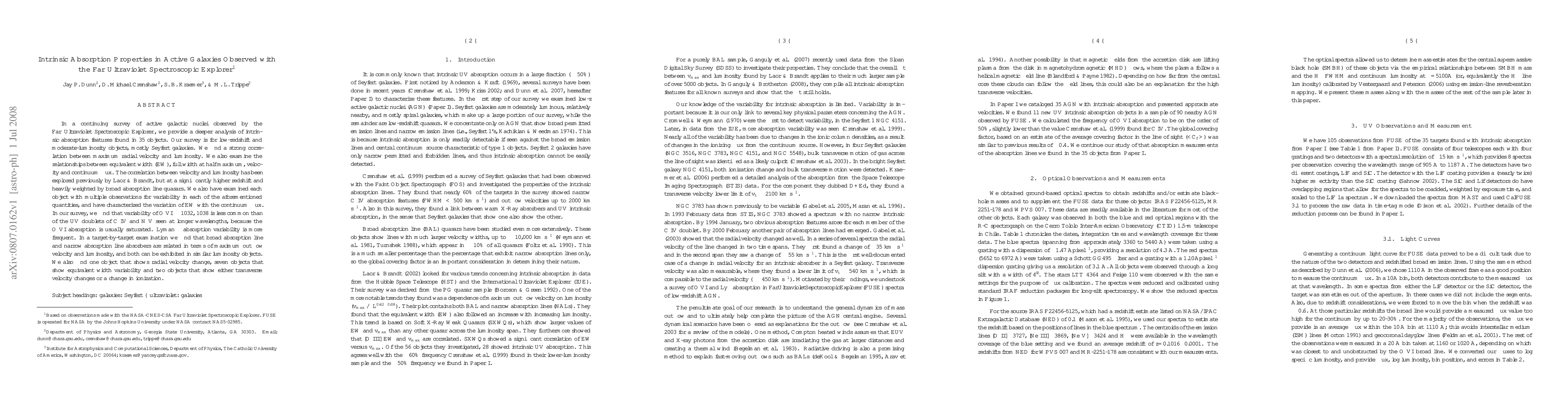 This paper analyzes intrinsic absorption features in 35 low-redshift, moderate-luminosity active galactic nuclei, mostly Seyfert galaxies, observed by the Far Ultraviolet Spectroscopic Explorer. It finds a strong correlation between maximum radial velocity and luminosity, and examines relationships between equivalent width, velocity, and continuum flux, noting variability in absorption features with the continuum flux.