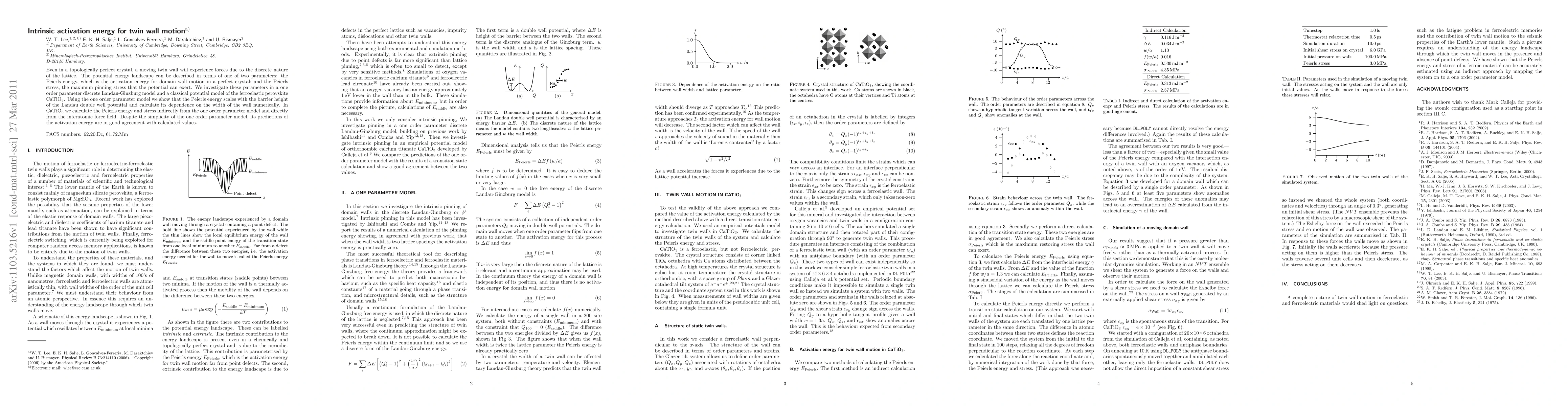 Even in a topologically perfect crystal, a moving twin wall will experience forces due to the discrete nature of the lattice. The potential energy landscape can be described in terms of one of two parameters: the Peierls energy, which is the activation energy for domain wall motion in a perfect crystal; and the Peierls stress, the maximum pinning stress that the potential can exert. We investigate these parameters in a one order parameter discrete Landau-Ginzburg model and a classical potential model of the ferroelastic perovskite CaTiO3. Using the one order parameter model we show that the Peierls energy scales with the barrier height of the Landau double well potential and calculate its dependence on the width of the wall numerically. In CaTiO3 we calculate the Peierls energy and stress indirectly from the one order parameter model and directly from the interatomic force field. Despite the simplicity of the one order parameter model, its predictions of the activation energy are in good agreement with calculated values.