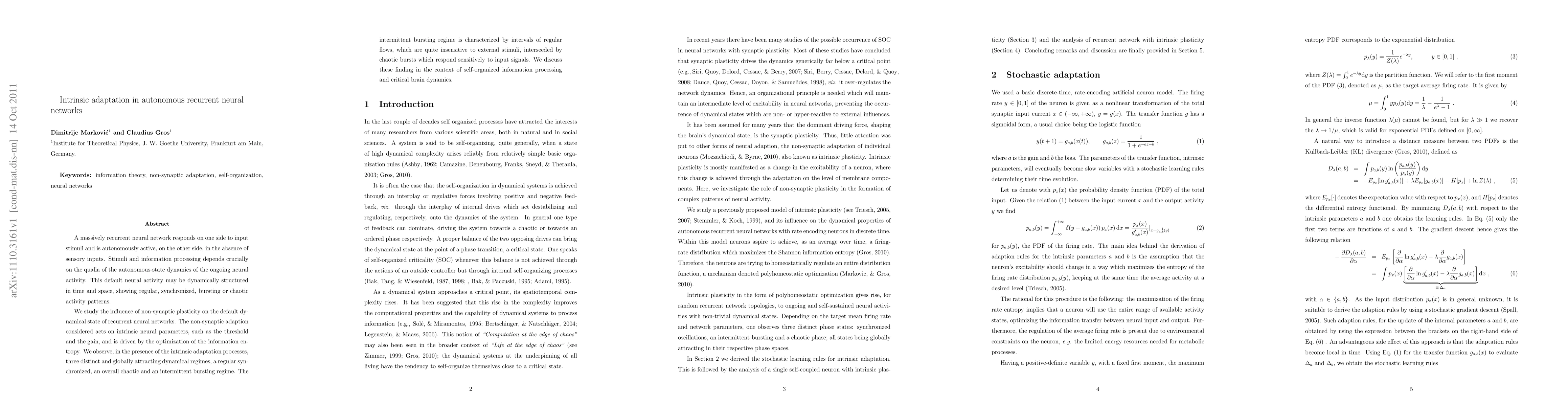 A massively recurrent neural network responds on one side to input stimuli and is autonomously active, on the other side, in the absence of sensory inputs. Stimuli and information processing depends crucially on the qualia of the autonomous-state dynamics of the ongoing neural activity. This default neural activity may be dynamically structured in time and space, showing regular, synchronized, bursting or chaotic activity patterns. We study the influence of non-synaptic plasticity on the default dynamical state of recurrent neural networks. The non-synaptic adaption considered acts on intrinsic neural parameters, such as the threshold and the gain, and is driven by the optimization of the information entropy. We observe, in the presence of the intrinsic adaptation processes, three distinct and globally attracting dynamical regimes, a regular synchronized, an overall chaotic and an intermittent bursting regime. The intermittent bursting regime is characterized by intervals of regular flows, which are quite insensitive to external stimuli, interseeded by chaotic bursts which respond sensitively to input signals. We discuss these finding in the context of self-organized information processing and critical brain dynamics.