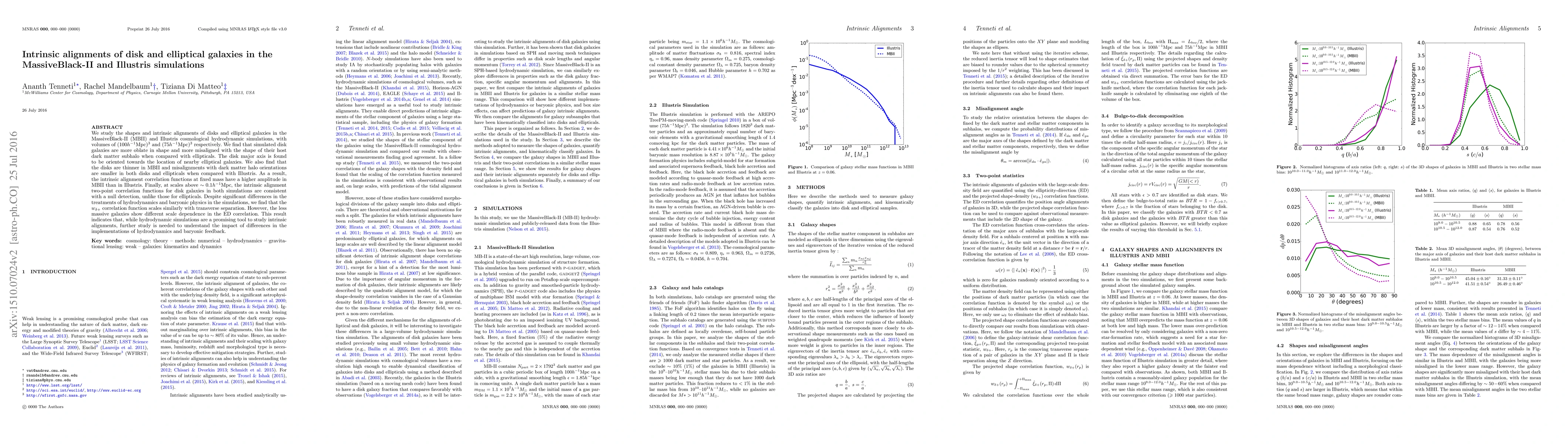 This study compares the intrinsic alignments of disk and elliptical galaxies in the MassiveBlack-II and Illustris simulations, finding that disk galaxies are more oblate and misaligned with their dark matter subhalos compared to ellipticals. The intrinsic alignment correlation functions show a higher amplitude in MBII than in Illustris, indicating differences in hydrodynamics and baryonic physics implementations.