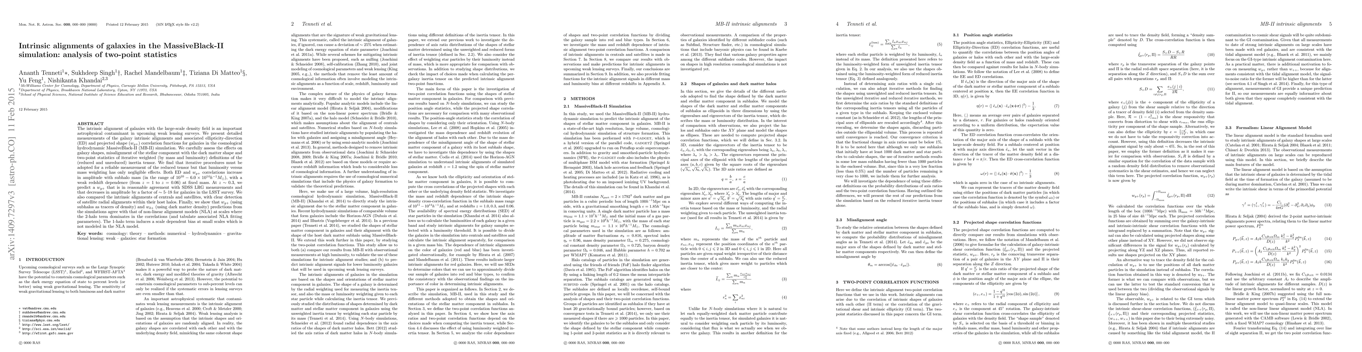This paper analyzes intrinsic galaxy alignments in the MassiveBlack-II simulation, finding that intrinsic alignments significantly affect weak lensing surveys. It shows that both ellipticity-direction and projected shape correlations increase with subhalo mass and have a weak redshift dependence, predicting a reduction in alignment amplitude for future surveys like LSST.