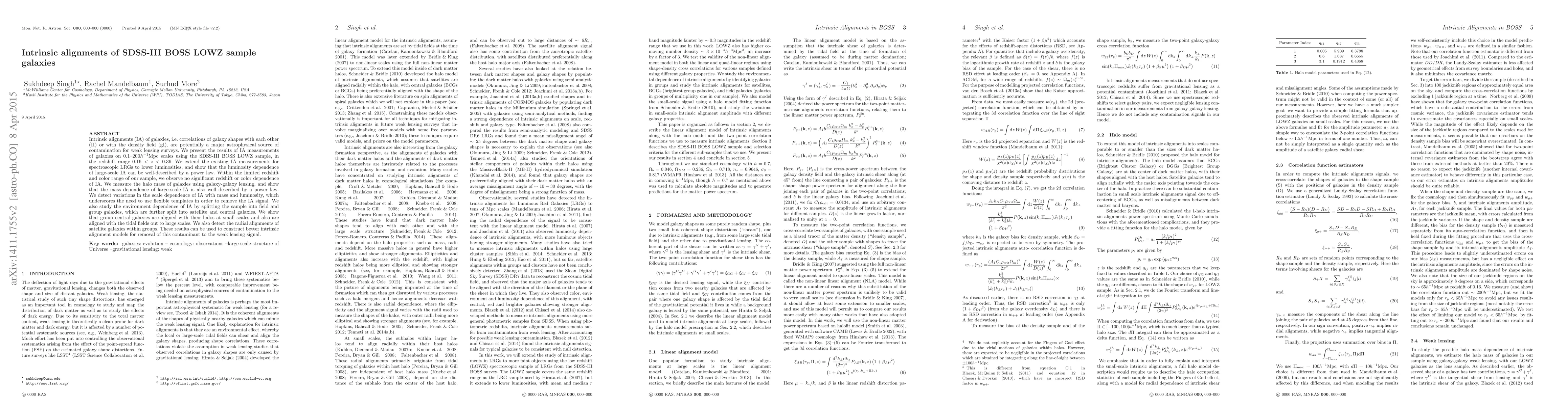 This paper measures intrinsic alignments (IA) of galaxies in the SDSS-III BOSS LOWZ sample, finding luminosity and halo mass dependencies that follow power laws. It highlights the need for flexible templates to remove IA signals and observes significant alignments in group central galaxies and satellite galaxies within groups.