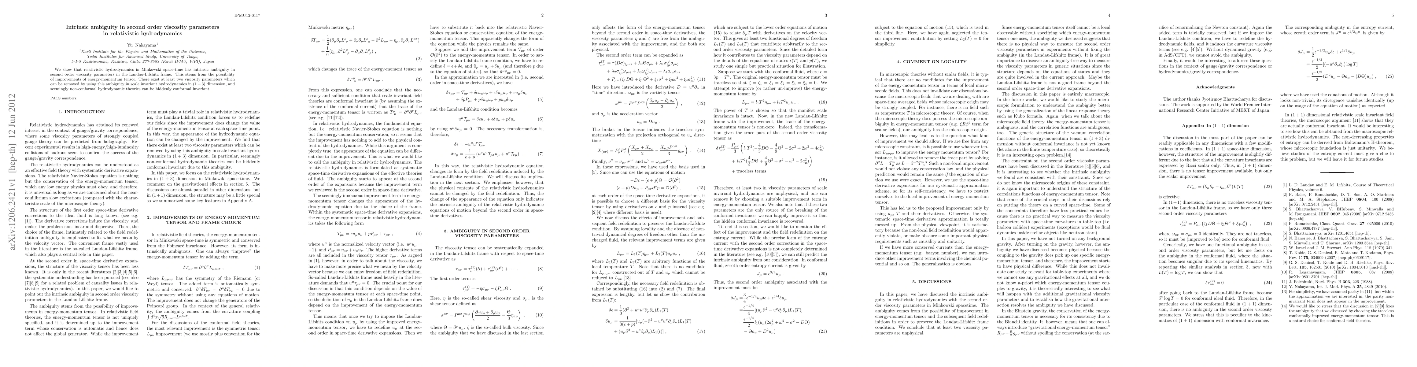 We show that relativistic hydrodynamics in Minkowski space-time has intrinsic ambiguity in second order viscosity parameters in the Landau-Lifshitz frame. This stems from the possibility of improvements of energy-momentum tensor. There exist at least two viscosity parameters which can be removed by using this ambiguity in scale invariant hydrodynamics in (1+3) dimension, and seemingly non-conformal hydrodynamic theories can be hiddenly conformal invariant.