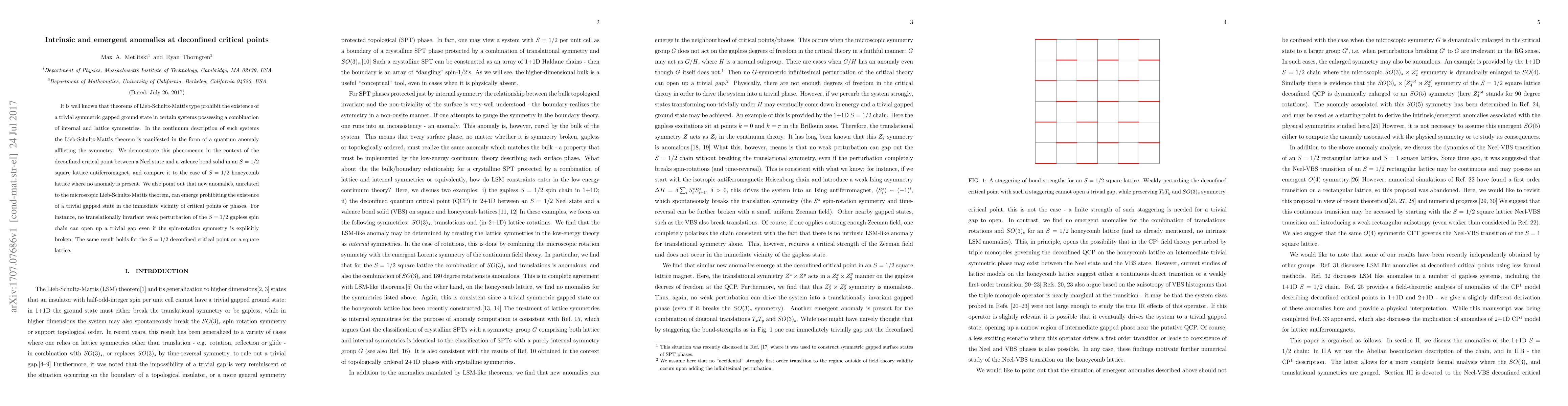 It is well known that theorems of Lieb-Schultz-Mattis type prohibit the existence of a trivial symmetric gapped ground state in certain systems possessing a combination of internal and lattice symmetries. In the continuum description of such systems the Lieb-Schultz-Mattis theorem is manifested in the form of a quantum anomaly afflicting the symmetry. We demonstrate this phenomenon in the context of the deconfined critical point between a Neel state and a valence bond solid in an $S =1/2$ square lattice antiferromagnet, and compare it to the case of $S=1/2$ honeycomb lattice where no anomaly is present. We also point out that new anomalies, unrelated to the microscopic Lieb-Schultz-Mattis theorem, can emerge prohibiting the existence of a trivial gapped state in the immediate vicinity of critical points or phases. For instance, no translationally invariant weak perturbation of the $S = 1/2$ gapless spin chain can open up a trivial gap even if the spin-rotation symmetry is explicitly broken. The same result holds for the $S =1/2$ deconfined critical point on a square lattice.