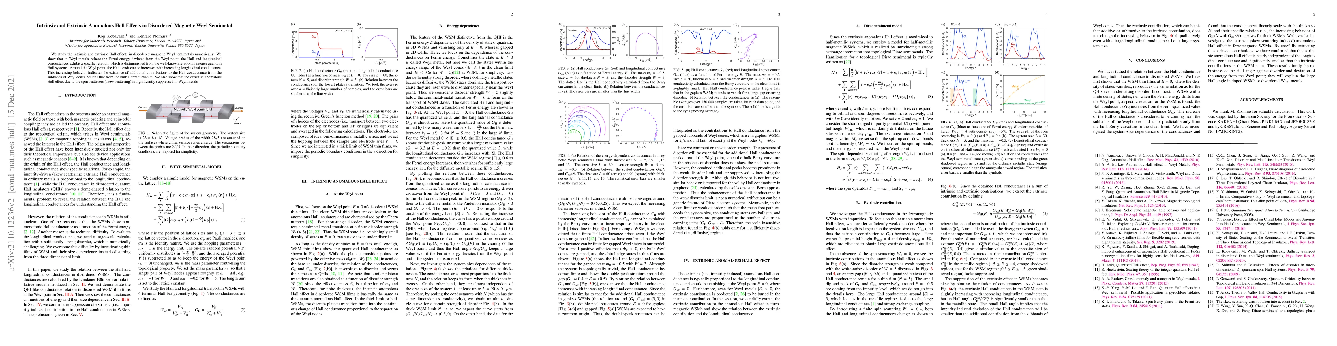This study numerically investigates intrinsic and extrinsic Hall effects in disordered magnetic Weyl semimetals, revealing unique conductance relations compared to integer quantum Hall systems. The intrinsic anomalous Hall effect shows increased Hall conductance with higher longitudinal conductance, indicating extra contributions from Weyl cone subbands. Meanwhile, the extrinsic anomalous Hall effect from spin scatterers is notably suppressed.