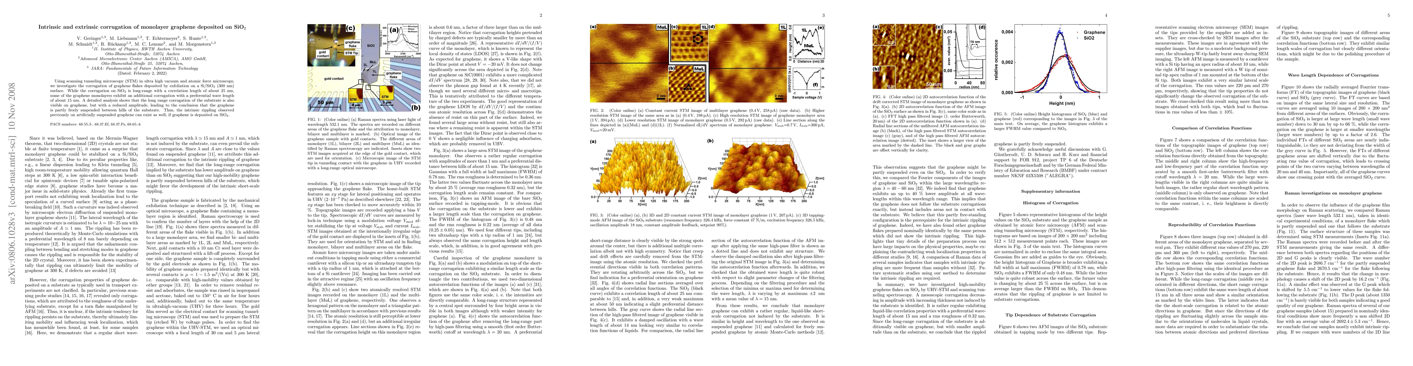 This research investigates the corrugation of graphene on SiO2 using STM and AFM, finding long-range corrugation from the substrate and additional intrinsic corrugation in some graphene monolayers. The study concludes that graphene can be partly suspended between substrate hills, showing intrinsic rippling similar to artificially suspended graphene.
