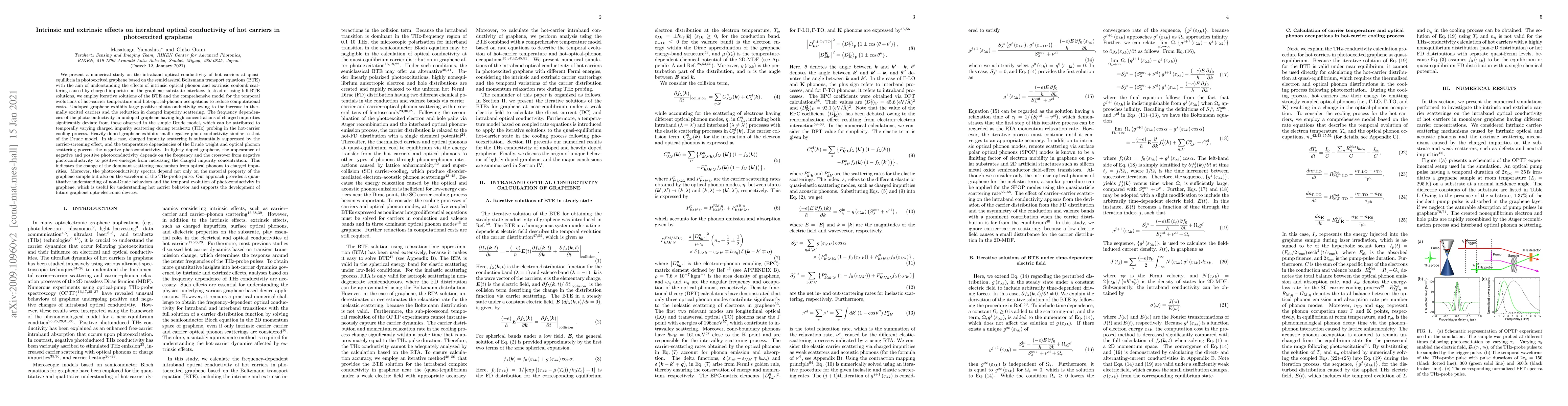 We present a numerical study on the intraband optical conductivity of hot carriers at quasi-equilibria in photoexcited graphene based on the semiclassical Boltzmann transport equations (BTE) with the aim of understanding the effects of intrinsic optical phonon and extrinsic coulomb scattering caused by charged impurities at the graphene--substrate interface. Instead of using full-BTE solutions, we employ iterative solutions of the BTE and the comprehensive model for the temporal evolutions of hot-carrier temperature and hot-optical-phonon occupations to reduce computational costs. Undoped graphene exhibits large positive photoconductivity owing to the increase in thermally excited carriers and the reduction in charged impurity scattering. The frequency dependencies of the photoconductivity in undoped graphene having high concentrations of charged impurities significantly deviate from those observed in the simple Drude model, which can be attributed to temporally varying charged impurity scattering during terahertz (THz) probing in the hot-carrier cooling process. Heavily doped graphene exhibits small negative photoconductivity similar to that of the Drude model. In this case, charged impurity scattering is substantially suppressed by the carrier-screening effect, and the temperature dependencies of the Drude weight and optical phonon scattering governs the negative photoconductivity. In lightly doped graphene, the appearance of negative and positive photoconductivity depends on the frequency and the crossover from negative photoconductivity to positive emerges from increasing the charged impurity concentration. This indicates the change of the dominant scattering mechanism from optical phonons to charged impurities. Our approach provides a quantitative understanding of non-Drude behaviors and the temporal evolution of photoconductivity in graphene.