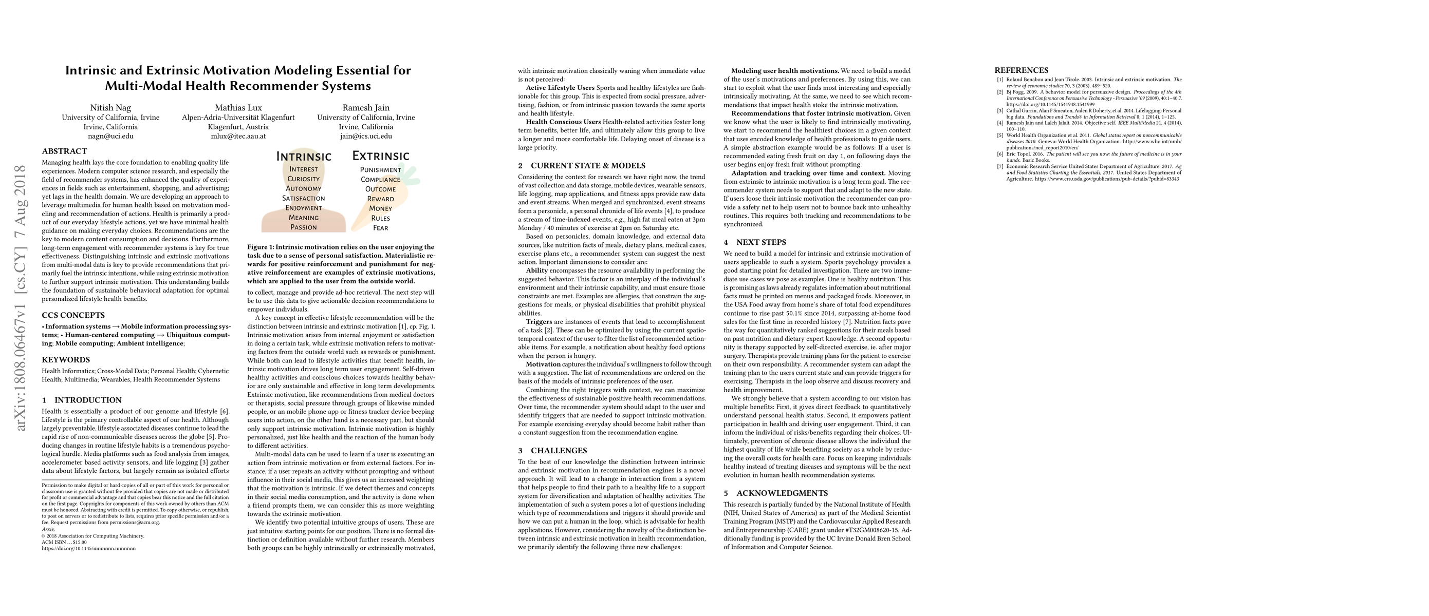 This paper proposes a method for developing multi-modal health recommender systems that leverages intrinsic and extrinsic motivation modeling to provide personalized health recommendations. The goal is to enhance long-term engagement and sustainable behavioral adaptation for optimal health outcomes through tailored lifestyle choices.