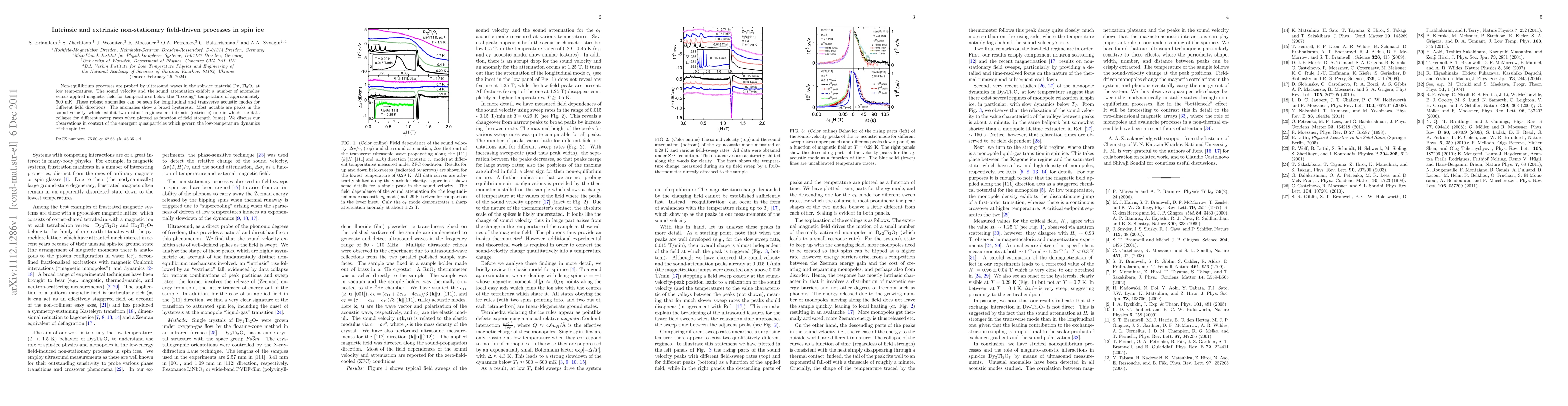 This paper investigates nonequilibrium processes in the spin-ice compound Dy2Ti2O7 using ultrasound waves, revealing anomalies in sound velocity and attenuation under applied magnetic fields. The study identifies intrinsic and extrinsic regimes in the anomalies, correlating them to the emergent quasiparticles influencing the material's low-temperature dynamics.