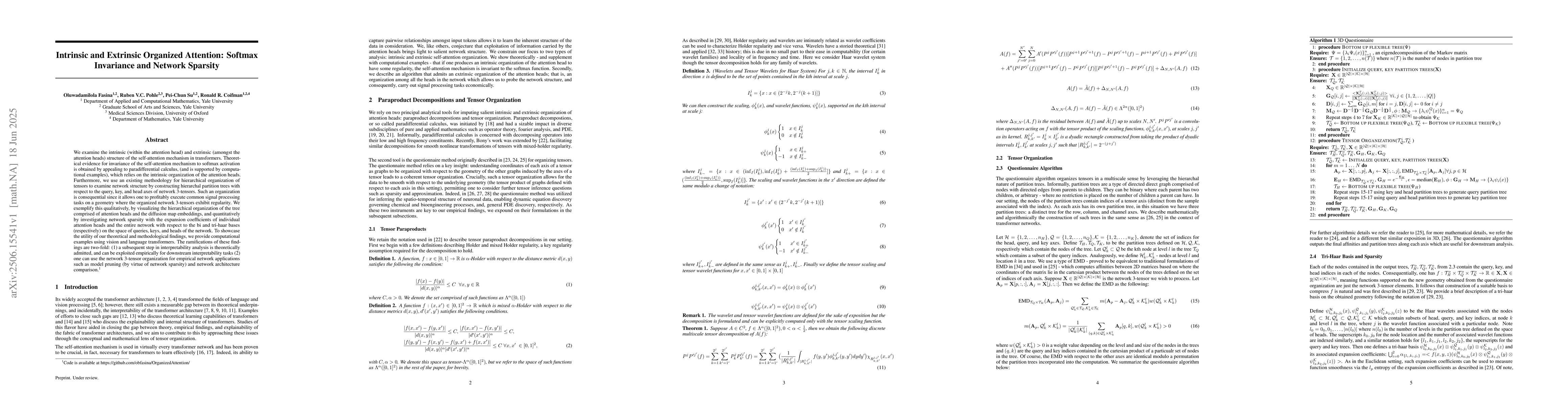 We examine the intrinsic (within the attention head) and extrinsic (amongst the attention heads) structure of the self-attention mechanism in transformers. Theoretical evidence for invariance of the self-attention mechanism to softmax activation is obtained by appealing to paradifferential calculus, (and is supported by computational examples), which relies on the intrinsic organization of the attention heads. Furthermore, we use an existing methodology for hierarchical organization of tensors to examine network structure by constructing hierarchal partition trees with respect to the query, key, and head axes of network 3-tensors. Such an organization is consequential since it allows one to profitably execute common signal processing tasks on a geometry where the organized network 3-tensors exhibit regularity. We exemplify this qualitatively, by visualizing the hierarchical organization of the tree comprised of attention heads and the diffusion map embeddings, and quantitatively by investigating network sparsity with the expansion coefficients of individual attention heads and the entire network with respect to the bi and tri-haar bases (respectively) on the space of queries, keys, and heads of the network. To showcase the utility of our theoretical and methodological findings, we provide computational examples using vision and language transformers. The ramifications of these findings are two-fold: (1) a subsequent step in interpretability analysis is theoretically admitted, and can be exploited empirically for downstream interpretability tasks (2) one can use the network 3-tensor organization for empirical network applications such as model pruning (by virtue of network sparsity) and network architecture comparison.