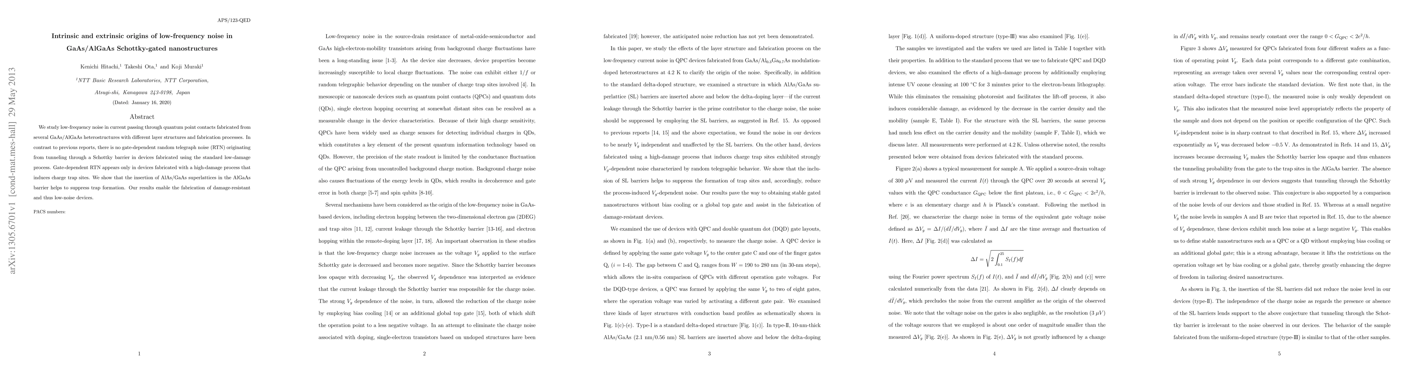 This paper investigates low-frequency noise in GaAs/AlGaAs quantum point contacts, finding no gate-dependent random telegraph noise in devices made with low-damage processes, while high-damage processes induce trap-related noise. The use of AlAs/GaAs superlattices reduces trap formation, enhancing device noise resistance.