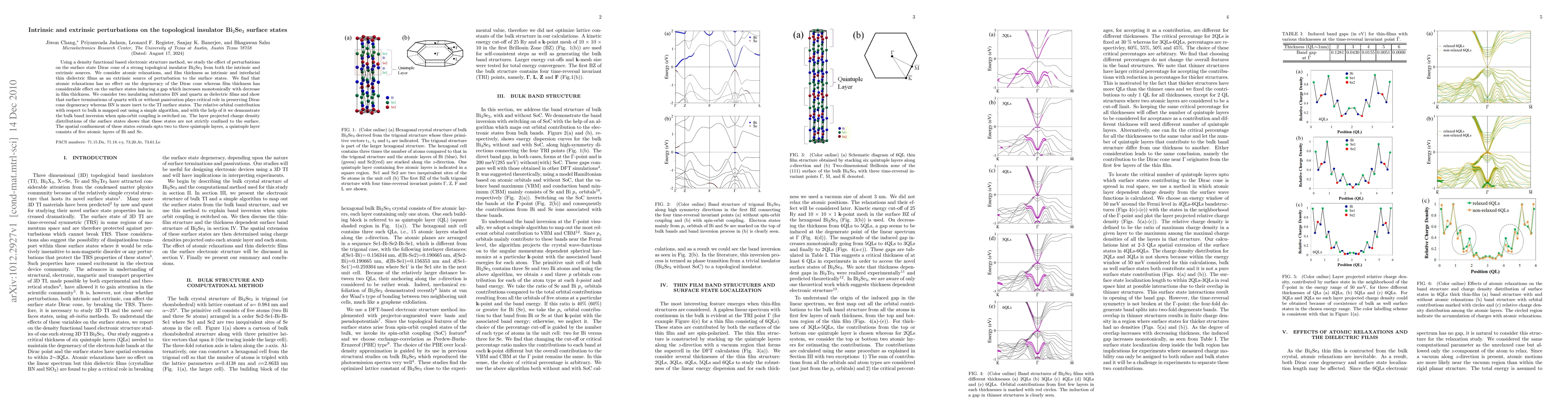 The research uses density functional theory to analyze the impact of intrinsic (atomic relaxations, film thickness) and extrinsic (interfacial dielectric films) perturbations on Bi2Se3's topological insulator surface states. Atomic relaxations have no effect on Dirac cone degeneracy, but film thickness opens a gap increasing with thinner films. Substrates BN and quartz influence surface states differently, with quartz preserving degeneracy. The study also reveals surface states' non-strict surface confinement extending up to three quintuple layers and demonstrates bulk band inversion with spin-orbit coupling.