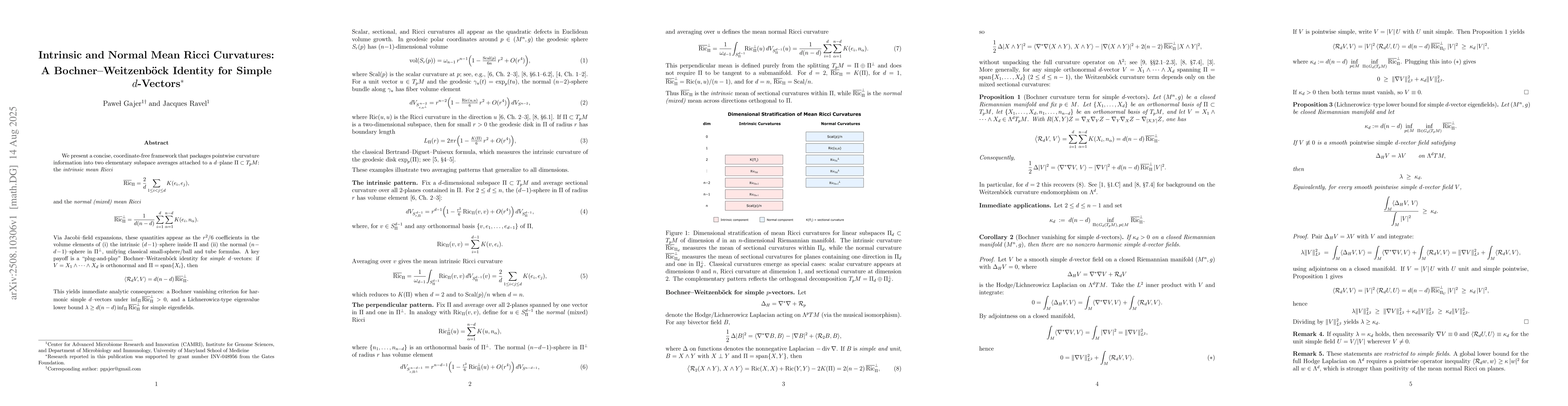 We introduce two pointwise subspace averages of sectional curvature on a d-dimensional plane Pi in T_p M: (i) the intrinsic mean Ricci (the average of sectional curvatures of 2-planes contained in Pi); and (ii) the normal (mixed) mean Ricci (the average of sectional curvatures of 2-planes spanned by one vector in Pi and one in Pi^perp). Using Jacobi-field expansions, these means occur as the r^2/6 coefficients in the intrinsic (d-1)-sphere and normal (n-d-1)-sphere volume elements. A direct consequence is a Bochner--Weitzenboeck identity for simple d-vectors V (built from an orthonormal frame X_1,...,X_d with Pi = span{X_i}): the curvature term equals d(n-d) times the normal mean Ricci of Pi. This yields two immediate applications: (a) a Bochner vanishing criterion for harmonic simple d-vectors under a positive lower bound on the normal mean Ricci; and (b) a Lichnerowicz-type lower bound for the first eigenvalue of the Hodge Laplacian on simple d-eigenfields.
