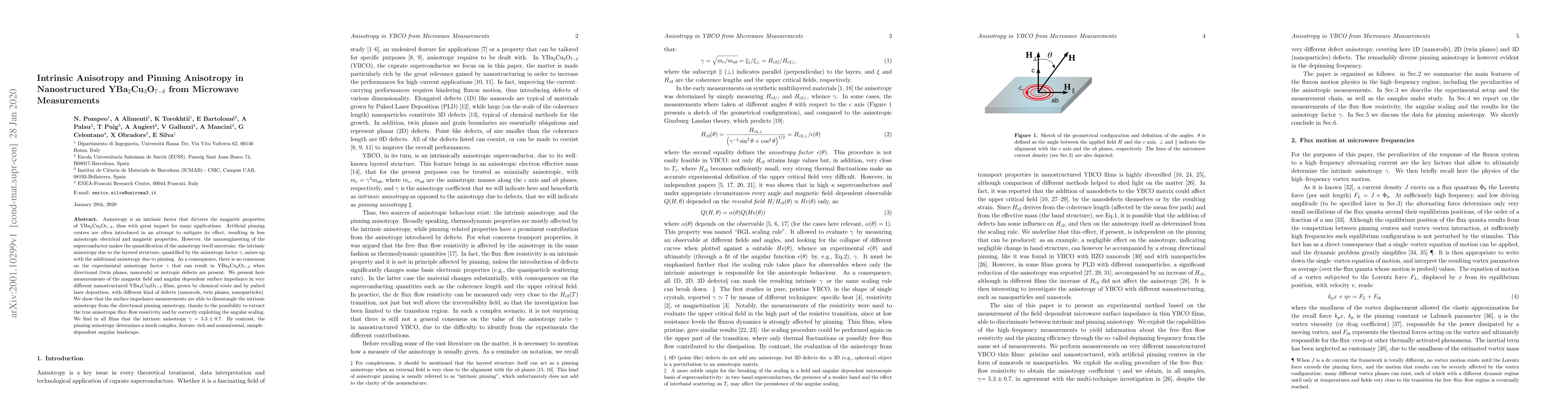 This paper investigates the intrinsic and pinning anisotropies in nanostructured YBa$_2$Cu$_3$O$_{7-\delta}$ (YBCO) superconductors using microwave measurements. The study reveals that intrinsic anisotropy $\gamma = 5.3\pm0.7$ is consistent across different films, while pinning anisotropy varies significantly depending on the specific defects present.