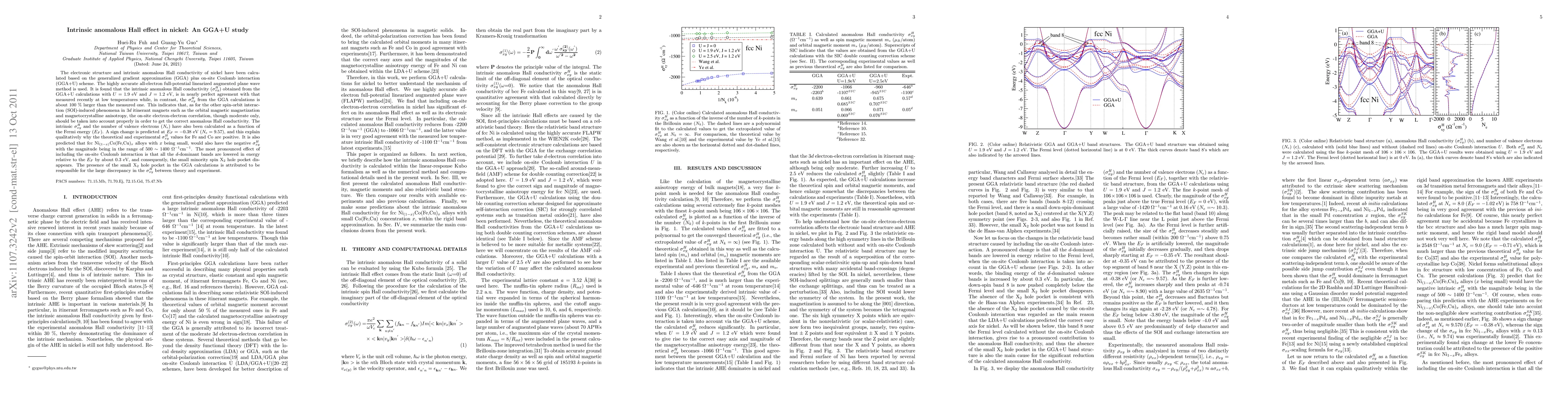 This study investigates the intrinsic anomalous Hall effect in nickel using GGA+U calculations, finding that including on-site Coulomb interaction ($U = 1.9$ eV, $J=1.2$ eV) aligns theoretical results with experimental measurements, while GGA alone significantly overestimates the anomalous Hall conductivity. The research also predicts a sign change in $\sigma_{xy}^H$ at $E_F = -0.38$ eV and suggests that small Ni-based alloys could exhibit negative $\sigma_{xy}^H$.
