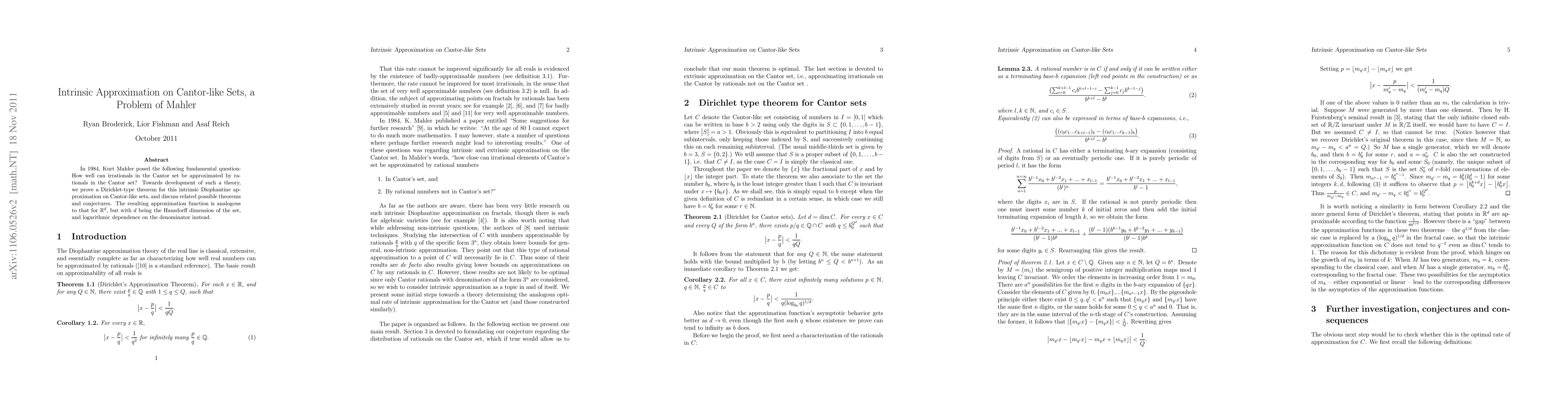 In 1984, Kurt Mahler posed the following fundamental question: How well can irrationals in the Cantor set be approximated by rationals in the Cantor set? Towards development of such a theory, we prove a Dirichlet-type theorem for this intrinsic diophantine approximation on Cantor-like sets, and discuss related possible theorems/conjectures. The resulting approximation function is analogous to that for R^d, but with d being the Hausdorff dimension of the set, and logarithmic dependence on the denominator instead.
