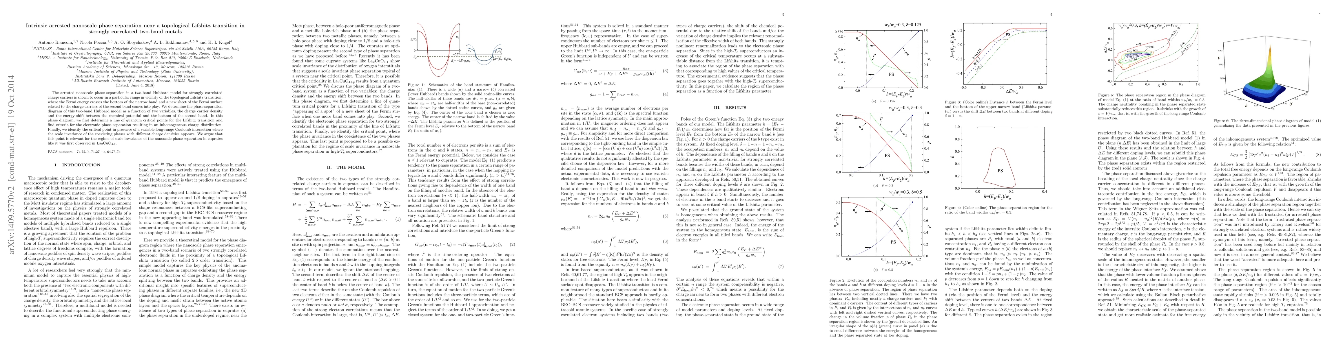 This paper investigates arrested nanoscale phase separation in strongly correlated two-band metals near a topological Lifshitz transition, determining the phase separation diagram and identifying the critical point for scale invariance, relevant to phenomena observed in cuprates like La$_2$CuO$_{4.1}$.